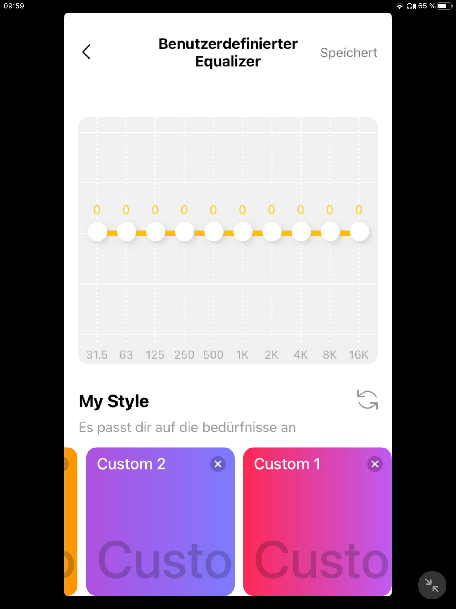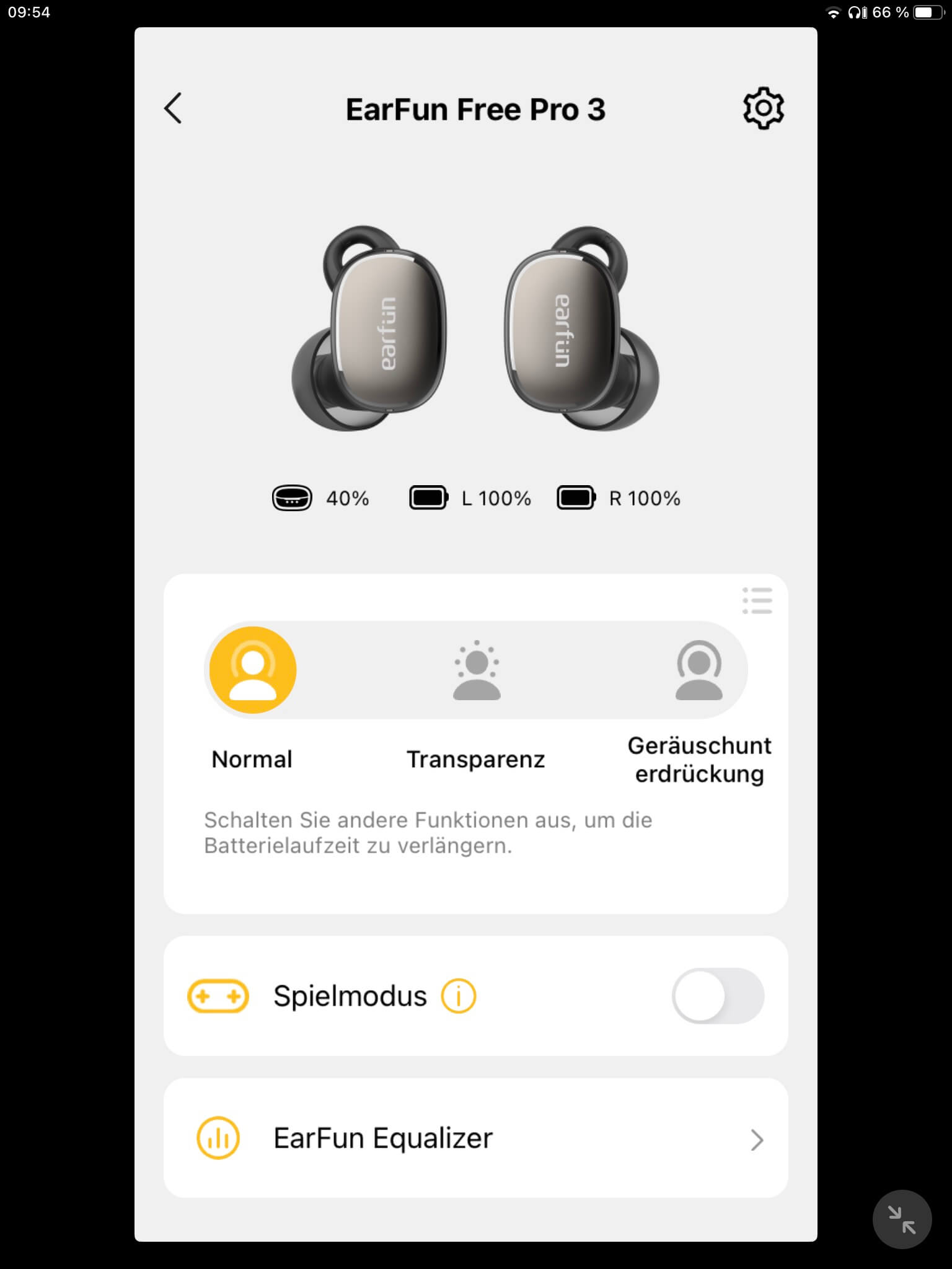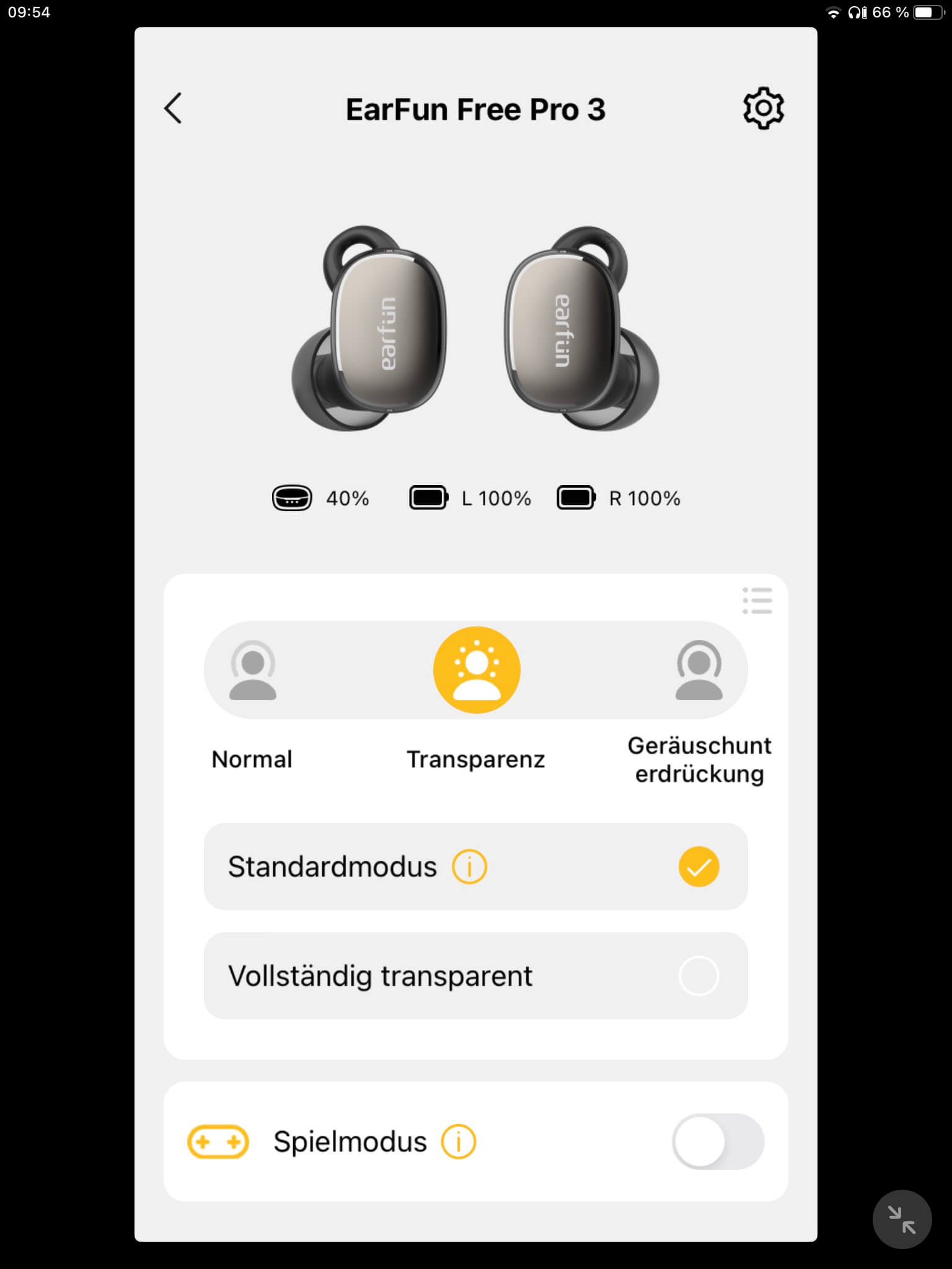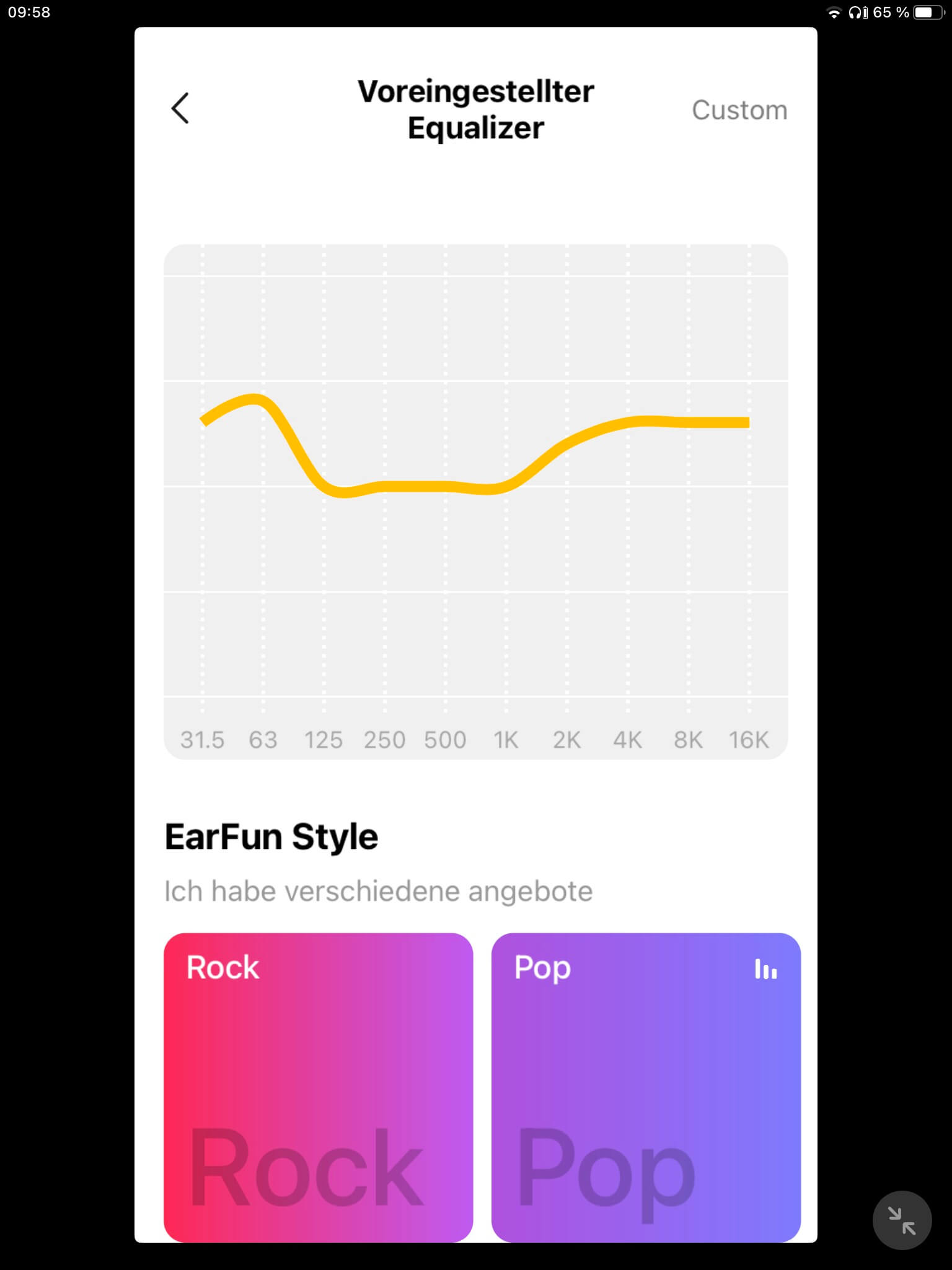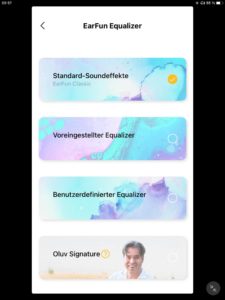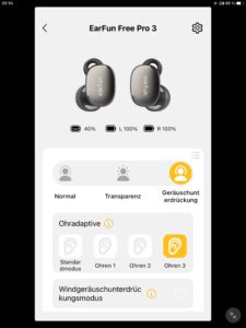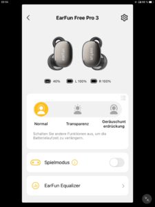 Ein zentrales Element der App-Anbindung (Android und iOS) stellt die Umgebungskontrolle dar, wobei sich die Geräuschunterdrückung der EarFun Free Pro 3 in einen Standardmodus, drei Varianten zur Ohrkanalanpassung und die Windgeräuschreduzierung unterteilt. Auch bei der Verstärkung an Außengeräuschen stehen mit „Standard“ und „vollständig transparent“ zwei Optionen zur Auswahl. Darüber hinaus stellt die Klangregelung zehn vorkonfigurierte Settings (Rock, Pop, Country, R&B, Classical, Jazz, Bassanhebung, Bassabsenkung, Höhenanhebung plus Höhenabsenkung) und einen EQ mit zehn Bändern für eigene Einstellungen zur Verfügung, die als Presets speicherbar sind. Klasse!
