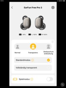 Die kabellosen In-Ears sind mit berührungsempfindlichen Oberflächen ausgestattet, über die sich die Wiedergabe steuern lässt und ein Vor- oder Zurückspringen bei der Titelauswahl, das Abwickeln von Telefonaten sowie eine Lautstärkeregelung erfolgen kann. Auch der Sprachassistent ist per Touch-Steuerung aufrufbar und es kann zwischen ANC-, Transparenz- und Grundmodus umgeschaltet werden. Die Werkseinstellung ist dabei über die App an die eigenen Vorlieben anpassbar, wodurch sich das (De-)Aktivieren des Gaming-Modus nachrüsten lässt. Insofern deckt die Remote der EarFun Free Pro 3 einen hohen Funktionsumfang ab. Vermisst werden kann jedoch ein manuelles Ein- und Ausschalten der Hörer über die Touch-Oberflächen, wodurch das Case stets benötigt wird. Möglich ist hingegen eine einseitige Nutzung im Single-Betrieb.