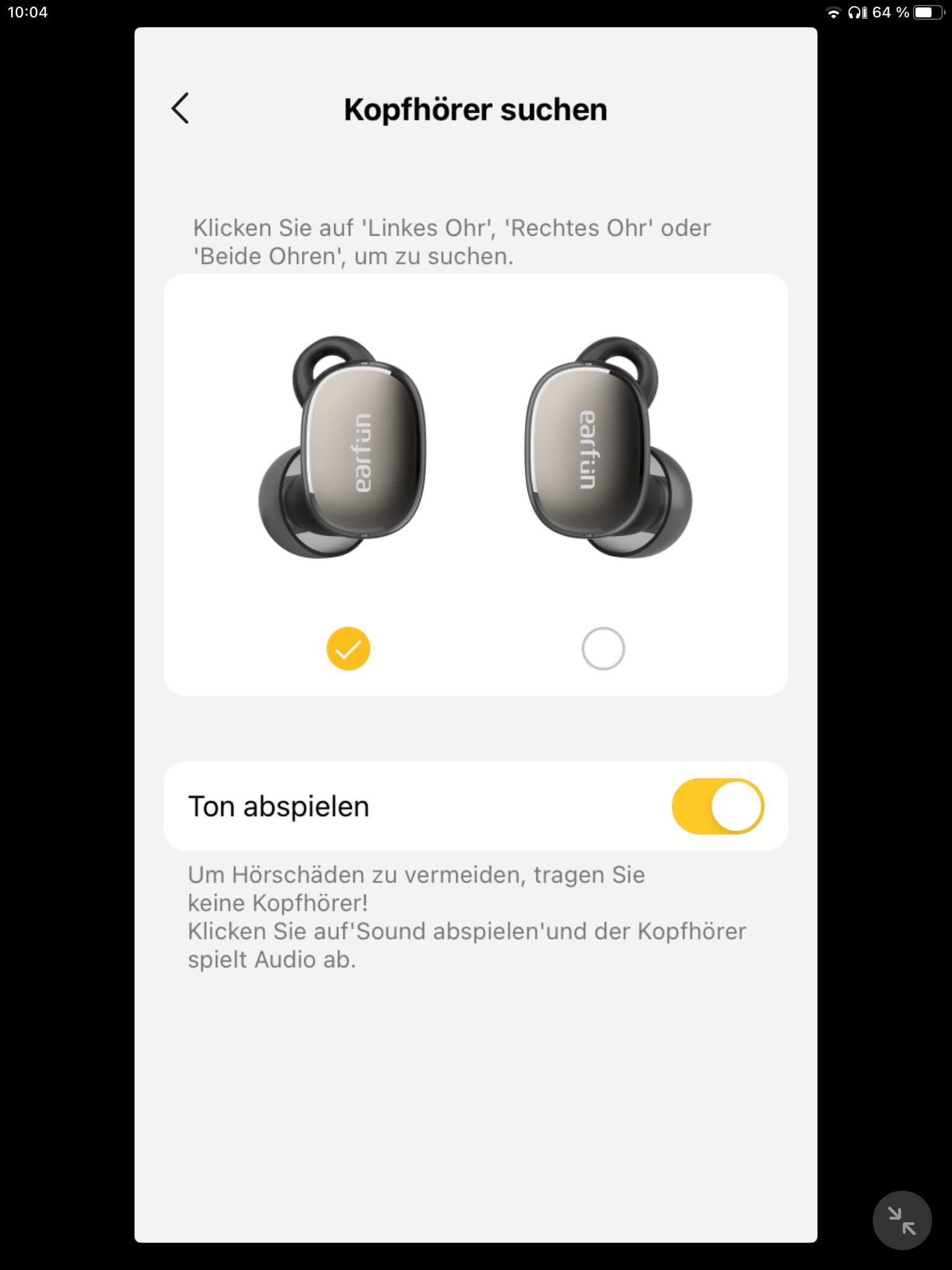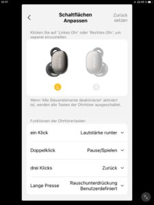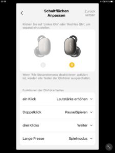 Neben der Touch-Steuerung lassen sich über die App die Lautstärke der Sprachansagen und die Mikrofontechnik für den Single-Betrieb einstellen. Darüber hinaus können Multipoint-Verbindungen und der latenzreduzierte Gaming-Modus (de-)aktiviert werden. Ebenfalls möglich sind Firmware-Aktualisierungen, während eine Suchfunktion per Piepton beim Auffinden der Hörer behilflich sein kann.