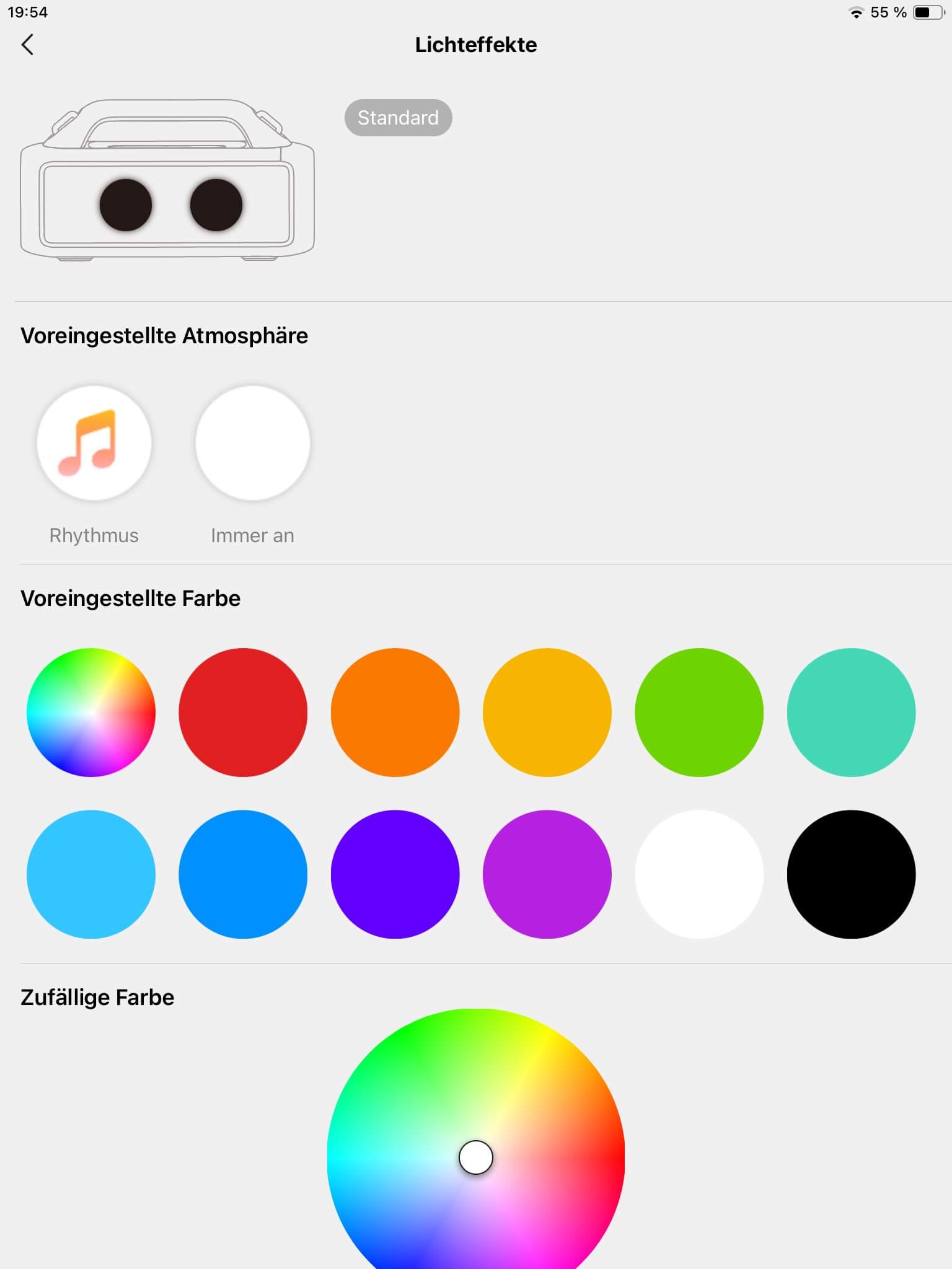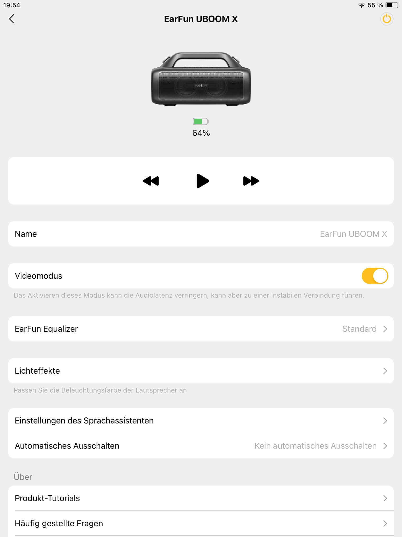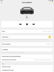 Auch die RGB-Beleuchtung der EarFun UBOOM X lässt sich über die App anpassen. Konfigurierbar ist die Farbe, was ebenfalls ein buntes Wechselspiel beinhaltet, wobei die Beleuchtung wahlweise rhythmisch oder statisch erfolgen kann. Des Weiteren lässt sich die Lautstärke der akustischen Rückmeldungen einstellen, ein Timer einrichten und der Videomodus aktivieren. Wer es eilig hat, kann die Box auch direkt über die App abschalten. Ansonsten ist ein Steuern der Wiedergabe möglich und es lassen sich Firmware-Aktualisierungen vornehmen.