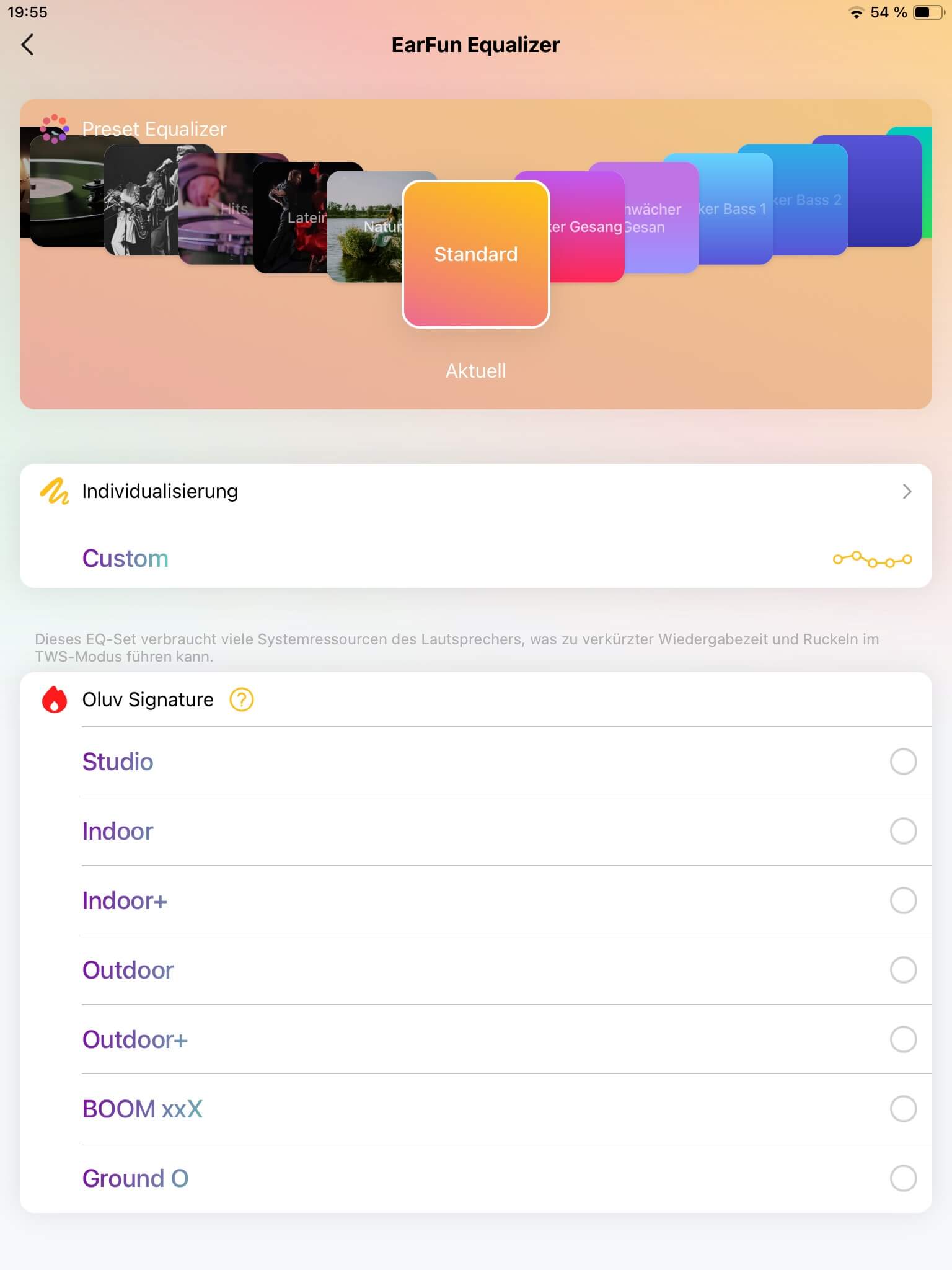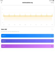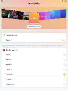 Die Klangregelung der App-Anbindung (Android und iOS) ist umfangreich ausgestattet und umfasst 14 Voreinstellungen zum Anheben oder Absenken von Bässen, Mitten und Höhen in unterschiedlichen Intensitätsstufen. Es folgen 15 genrespezifische Anpassungen für Hip-Hop, Pop oder Rock. Zur weiteren Auswahl stehen sieben Signature-Presets des Künstlers „Oluv“, die spezielle Abstimmungen für den In- und Outdoor-Einsatz, aber auch eine flach gehaltene Studio-Kurve bereitstellen. Allerdings ist bei der Nutzung der Signature-Settings aktuell ein erkennbarer Lautstärkeverlust vorhanden, der noch zu beheben wäre. Darüber hinaus besteht die Option, über einen EQ mit zehn Bändern eigene Einstellungen vorzunehmen, die als Presets speicherbar sind.