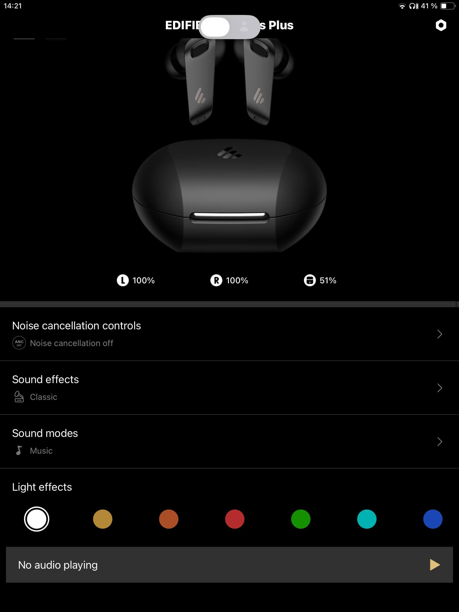 Neben der Stielsteuerung lässt sich noch ein Timer oder die Case-Beleuchtung konfigurieren, wobei für die persönliche „Light-Show“ in K.I.T.T.-Manier acht Farben zur Auswahl stehen. Des Weiteren ist ein Umschalten zwischen Grund-, Gaming- und Theatermodus oder ein (De-)Aktivieren der Multipoint-Verbindungen möglich. Eine Suchfunktion kann darüber hinaus per Piepton dabei behilflich sein, die Hörer wieder zu finden. Ansonsten lassen sich Firmware-Aktualisierungen vornehmen und es kann die Wiedergabe gesteuert sowie die Lautstärke geregelt werden. Auf Android-Geräten besteht zudem die Option, die hochauflösenden Codecs einzurichten.