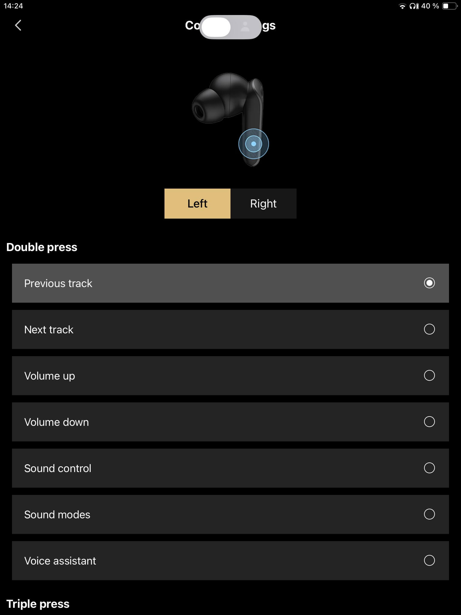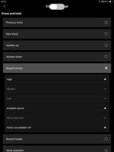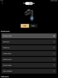 Während ab Werk ein Vor- und Zurückspringen für die Titelauswahl sowie ein Umschalten zwischen Grund-, ANC- und Umgebungsmodus vorgesehen sind, lässt sich der Funktionsumfang über die App erweitern. Als Optionen stehen eine Lautstärkeregelung, das Aufrufen des Sprachassistenten oder der Gaming-Modus zur Auswahl. Ein Umschalten in den Theatermodus (siehe unten) ist dagegen nicht möglich, was ebenfalls auf ein manuelles Ein- und Ausschalten der Hörer zutrifft.