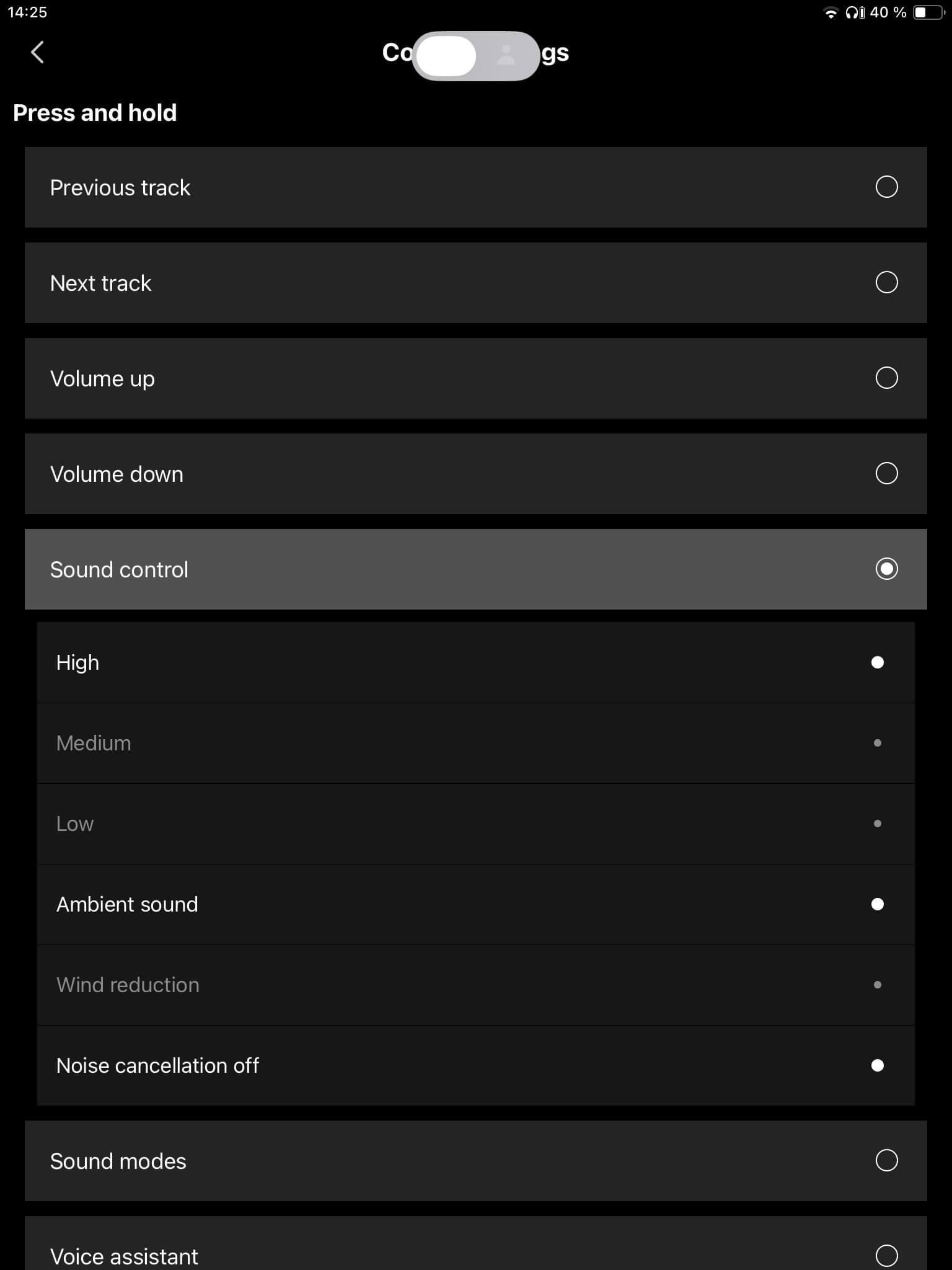 Über die Geräuschkontrolle besteht Zugriff auf die ANC-Betriebsarten „Low“, „Medium“ und „High“, wodurch sich das Noise Cancelling an unterschiedliche Umgebungen anpassen lässt. Für Aktivitäten an der frischen Luft steht zudem eine Windgeräuschunterdrückung bereit. Die Verstärkung des Außenbereichs kann im Umgebungsmodus außerdem anhand von sieben Intensitätsstufen eingestellt werden.