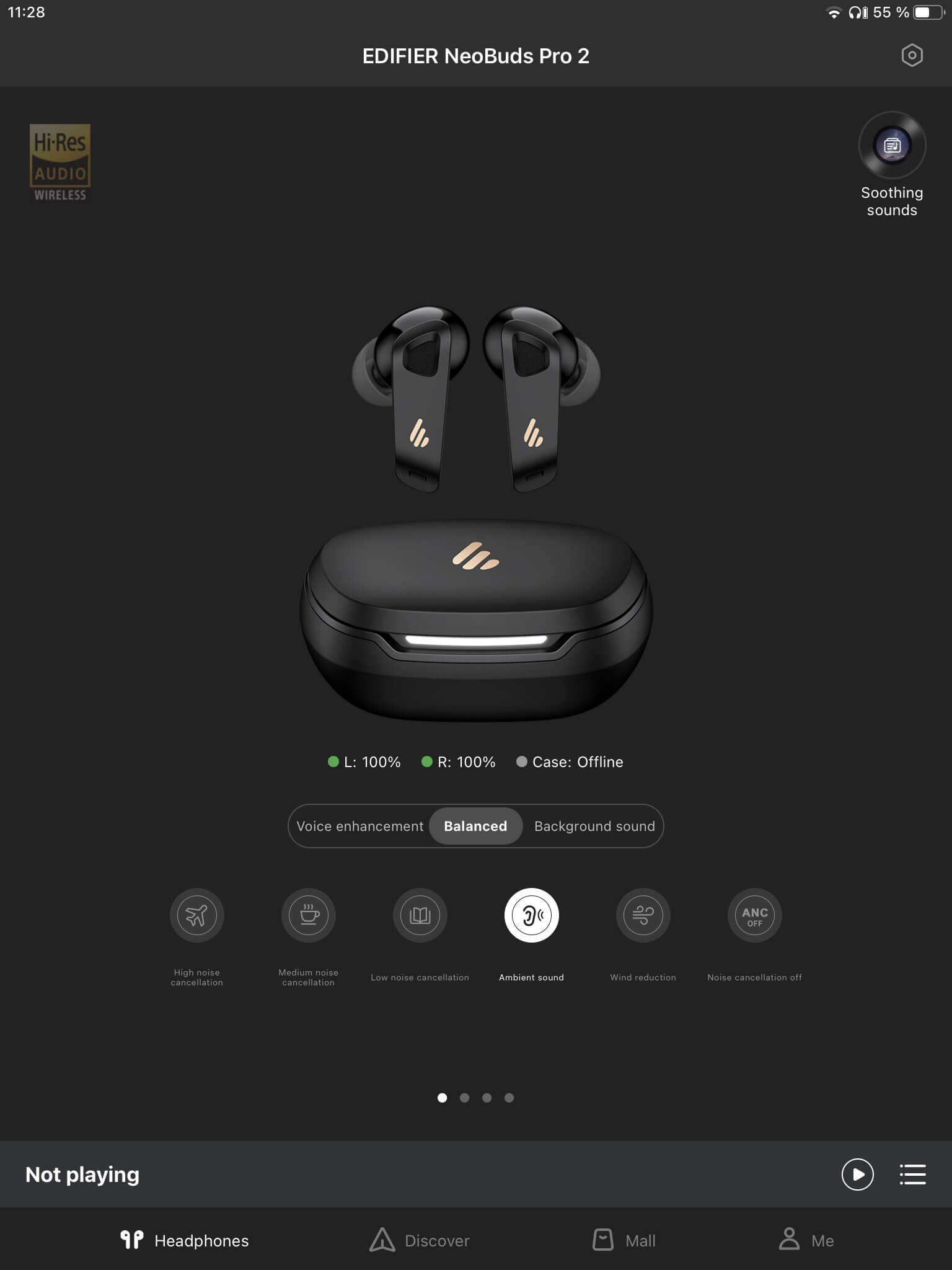 Ein zentrales Element der App-Anbindung (Android und iOS) stellt die Umgebungsgeräuschkontrolle der Hörer dar. Mit „Low“, „Medium“ und „High“ unterteilt sich das Noise Cancelling der NeoBuds Pro 2 dabei in drei Stufen, die um eine gezielte Windgeräuschunterdrückung ergänzt werden. Darüber hinaus stehen mit „Voice enhancement“, „Balanced“ und „Background sound“ drei Transparenzmodi zur Verfügung.