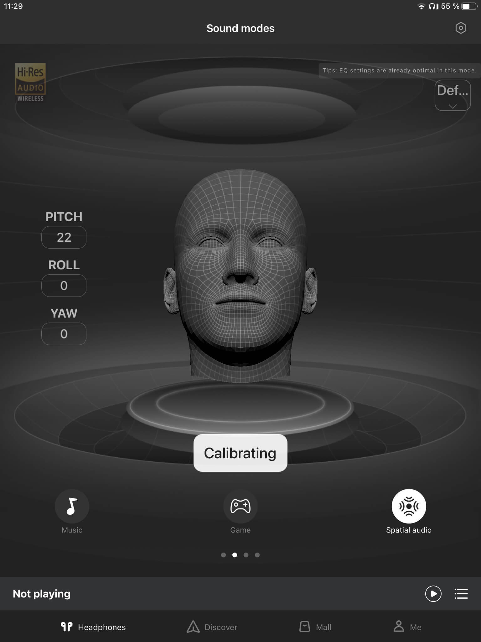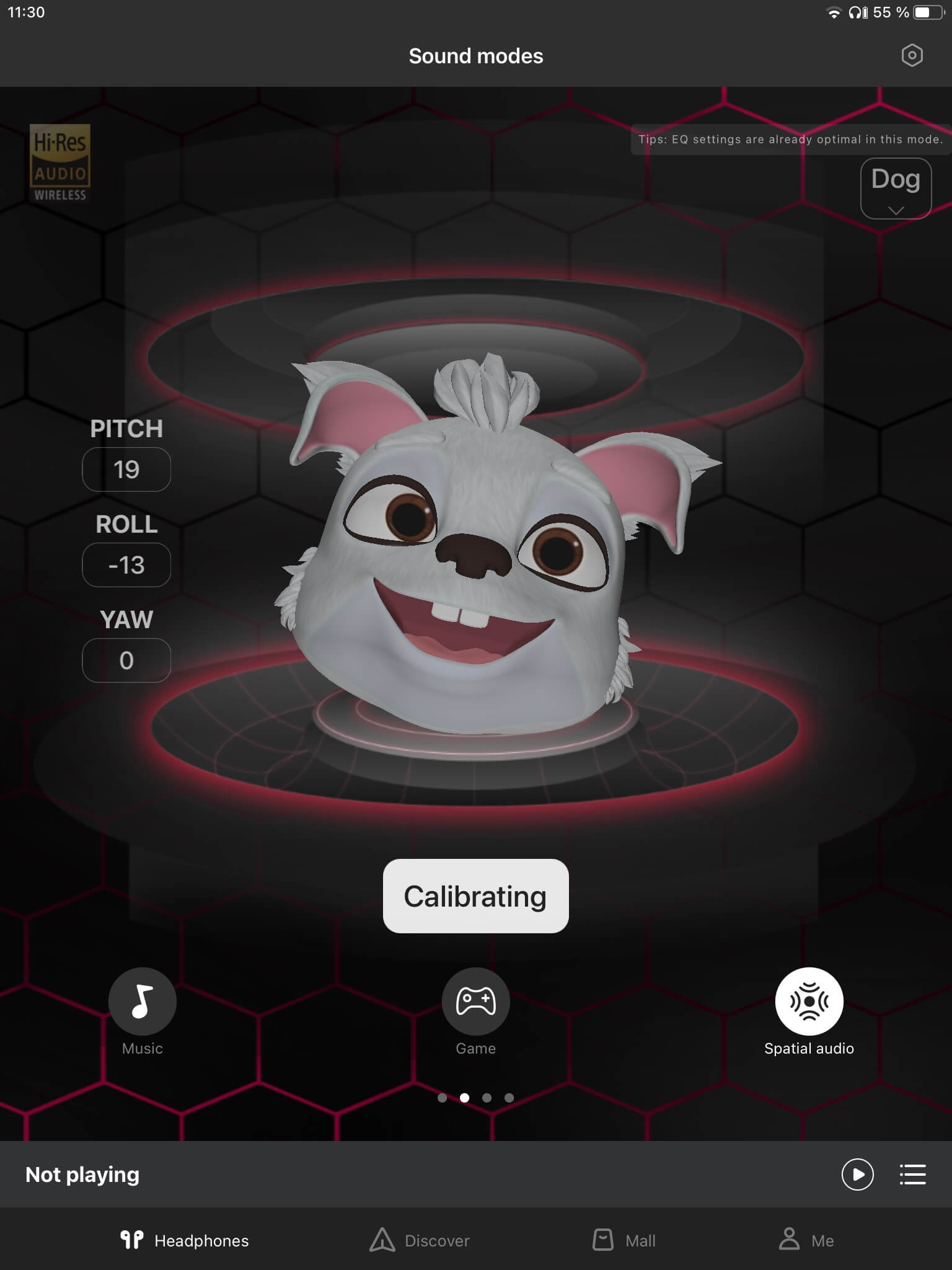 Für den kinoähnlichen Surround-Sound mit einer dynamischen Verfolgung der Kopfbewegung nutzen die Hörer ein Gyroskop und eine Geschwindigkeitserfassung. Dabei wird das sogenannte Head-Tracking über die App zunächst einmal kalibriert und im Anschluss visualisiert, was standardmäßig durch einen neutralen Kopf erfolgt. Als Gimmick sind jedoch auch Figuren im Comic Style einsetzbar, und zwar ein Hund sowie Mädchen oder Junge, was witzig gemacht ist. Darüber hinaus werden Kopfbewegungen sicher erkannt, auch wenn eine leichte Verzögerung bei der Umsetzung spürbar ist. Ein überzeugendes „Mittendrin-Gefühl“ zu vermitteln, gelingt der Funktion jedoch nicht, was primär an der Klangabstimmung liegt, die Stimmen überfokussiert. Hierdurch rückt die Moderation bei einer Sportübertragung raumeinnehmend in den Vordergrund, während die Kulisse, welche entscheidend für die Atmosphäre ist, lediglich dezent im Hintergrund wahrgenommen werden kann.