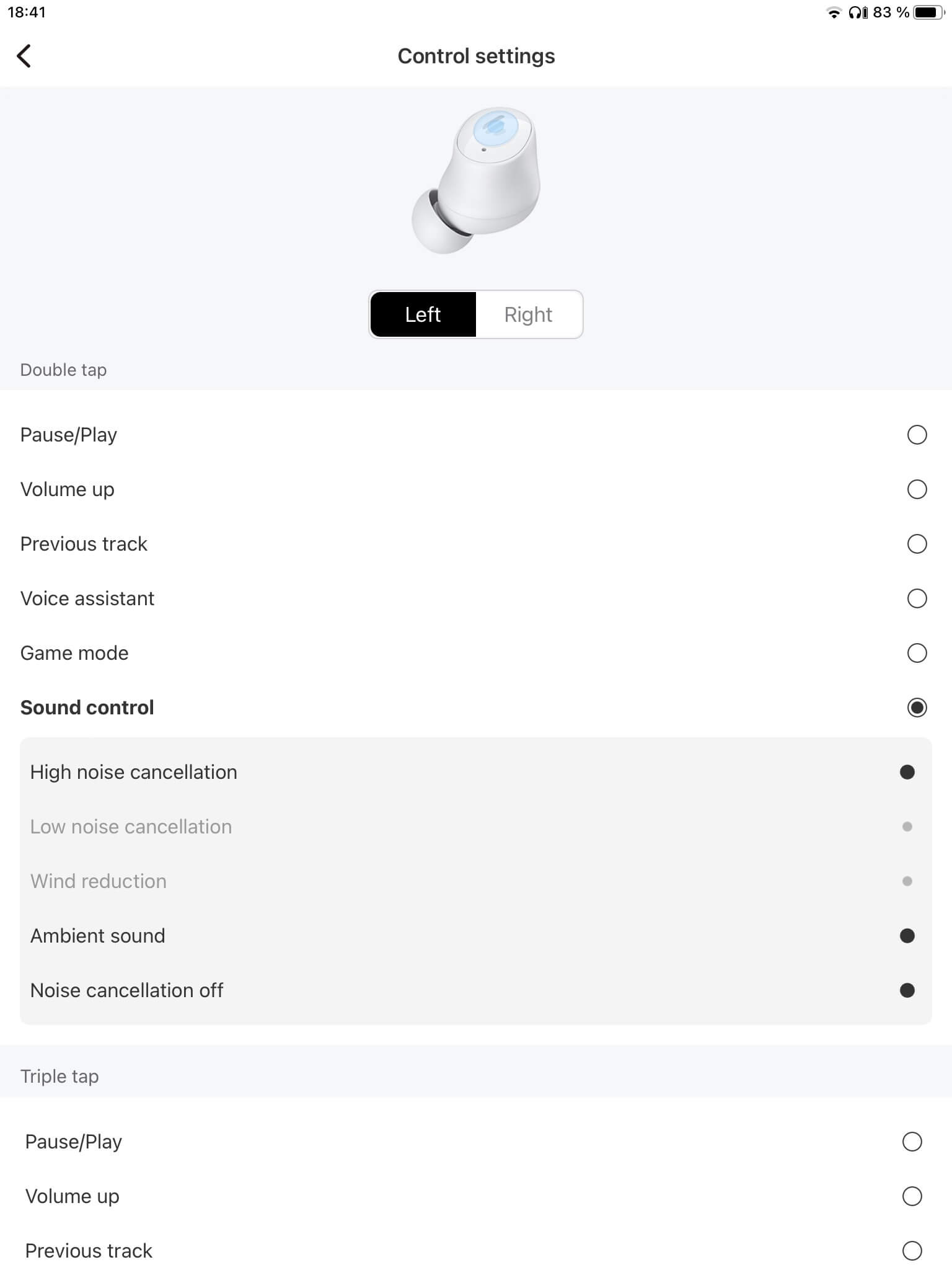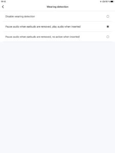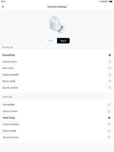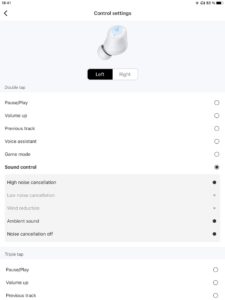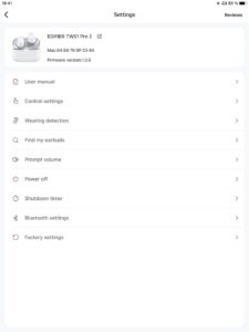 Über die App ist die Touch-Steuerung zudem anpassbar, wodurch beispielsweise der Sprachassistent oder eine Lautstärkeregelung ausgewählt werden können. Allerdings ist das Kontingent an belegbaren Steuerungsoptionen auf ein zwei- und dreifaches Antippen pro Seite begrenzt, während auf Gesten wie ein Halten verzichtet wurde. Auch ein manuelles Ein- und Ausschalten der TWS1 Pro 2 über die Touch-Oberflächen ist nicht vorgesehen. Möglich ist dagegen eine einseitige Nutzung im Single-Betrieb.