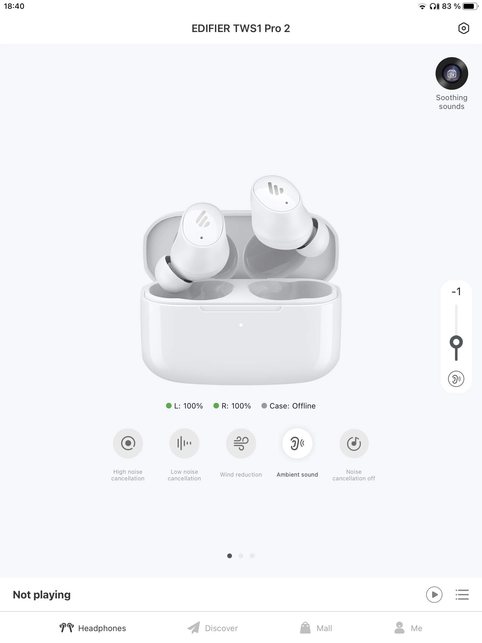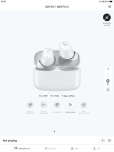 Über die App-Anbindung (Android und iOS) der Edifier TWS1 Pro 2 steht eine Umgebungsgeräuschkontrolle zur Verfügung, die sich in ein hohes oder leichtes Noise Cancelling, eine spezielle Windgeräuschunterdrückung zum Beispiel für Fahrradtouren und einen regelbaren Transparenzmodus unterteilt. Die Verstärkung an Außengeräuschen kann dabei anhand von sieben Intensitätsstufen an die Umgebung angepasst werden.