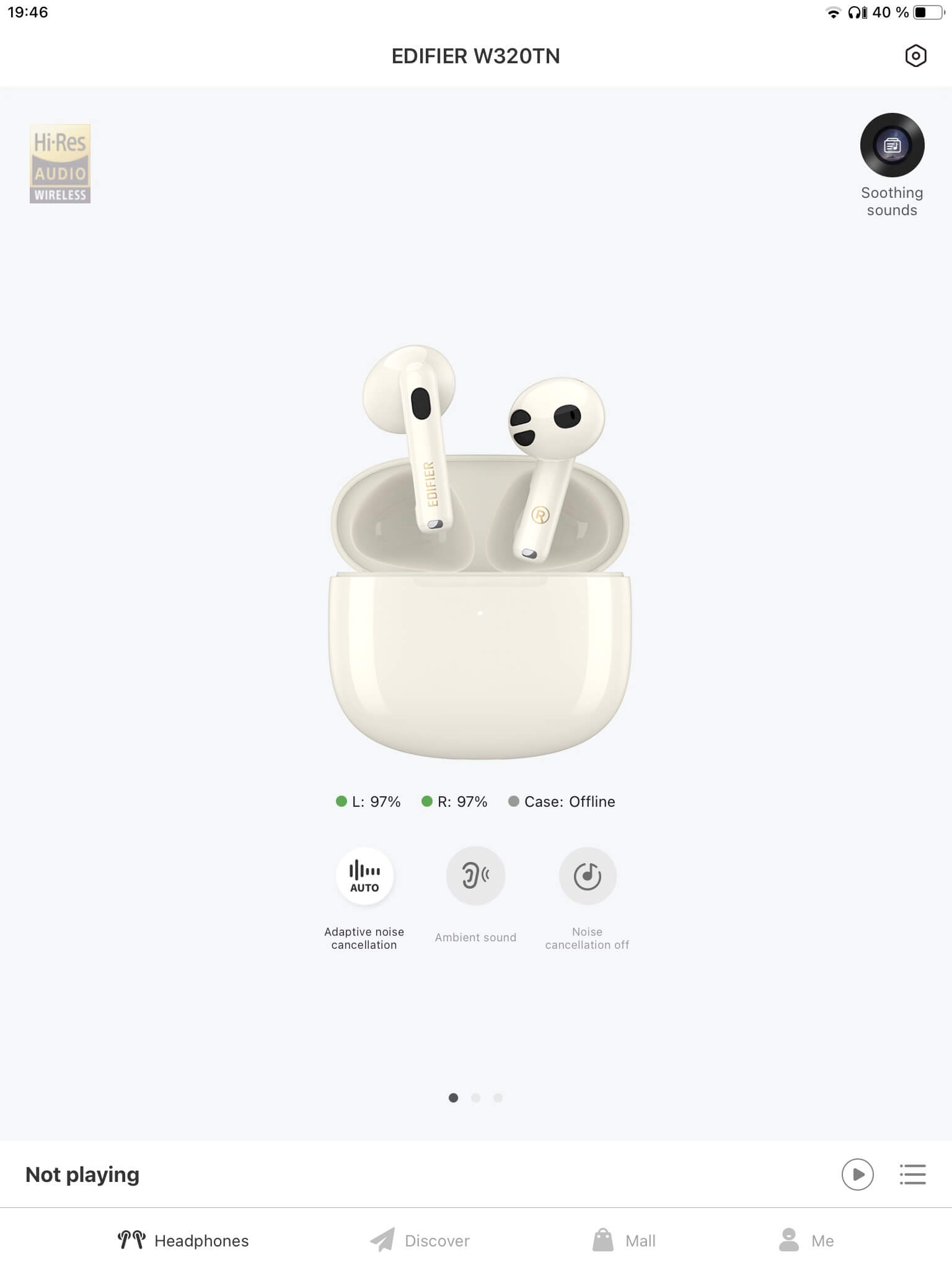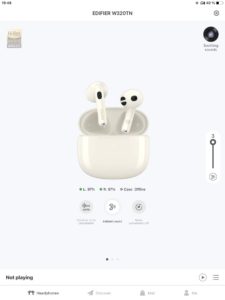 Nachrüstbar ist zudem eine Lautstärkeregelung und der Gaming-Modus, da die Remote der Edifier W320TN bis auf einfaches Drücken, was der Wiedergabesteuerung vorbehalten ist, an die eigenen Vorlieben angepasst werden kann. Nicht vorgesehen ist hingegen ein manuelles Ein- und Ausschalten über den drucksensitiven Stielbereich, wodurch das Case stets benötigt wird. Ergänzend ist noch eine Trageerkennung nutzbar, die sich über die App (de-)aktivieren lässt.