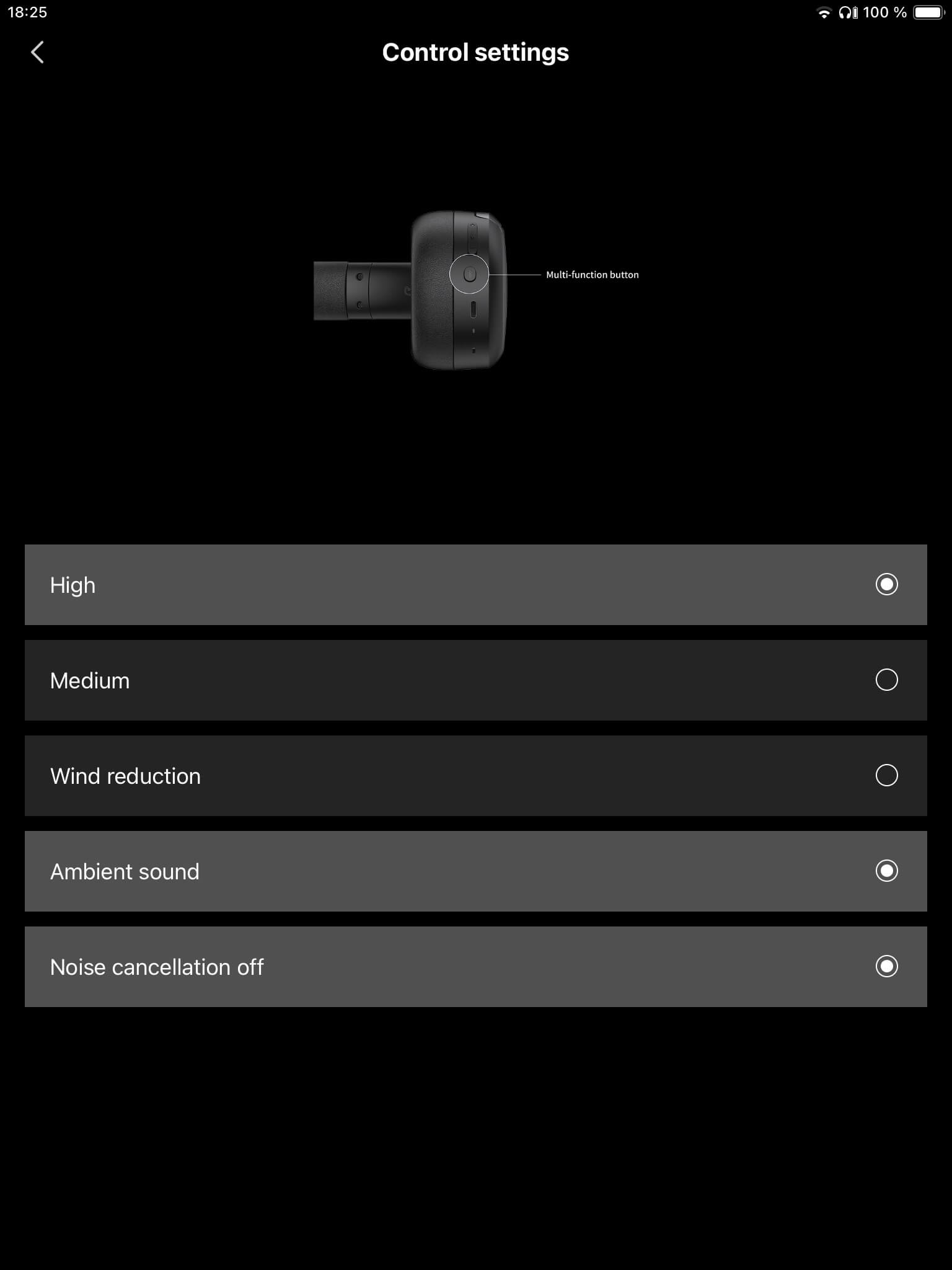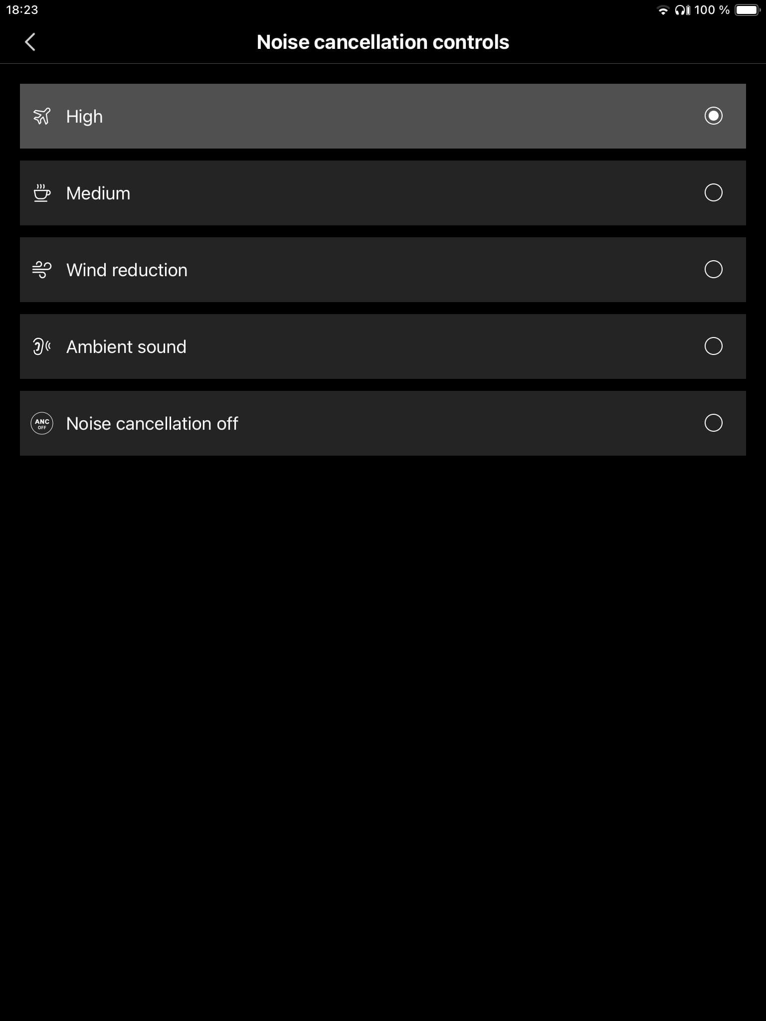 Die Umgebungskontrolle der App-Anbindung (Android und iOS) unterteilt sich mit „High“, „Medium“ und einer Variante zur Windgeräuschunterdrückung für Outdoor-Aktivitäten in drei ANC-Betriebsarten. Sieben Intensitätsstufen bietet darüber hinaus der Transparenzmodus zur Anpassung.