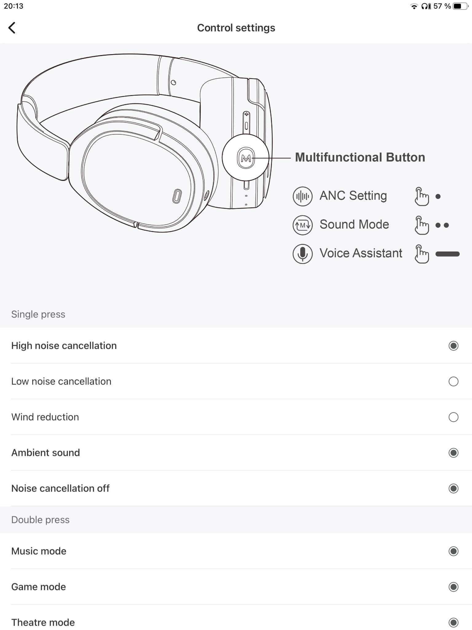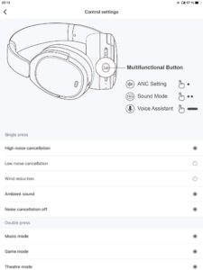 An Bedienelementen steht eine klassische 3-Tasten-Remote für die Wiedergabesteuerung, das Abwickeln von Telefonaten, ein Vor- und Zurückspringen bei der Titelauswahl sowie das Einstellen der Lautstärke zur Verfügung. Ergänzend befindet sich ebenfalls an der rechten Schalenseite noch ein separater Multifunktionstaster, der über die App konfigurierbar ist. Ab Werk dient einfaches Drücken zum Umschalten zwischen ANC-, Umgebungs- und Grundmodus, während ein Gedrückthalten den Sprachassistenten aufruft. Durch doppeltes Drücken kann darüber hinaus zwischen den drei Betriebsarten „Musik“, „Gaming“ (Low-Latency-Modus) und „Theater“ (Surround Sound) gewechselt werden.