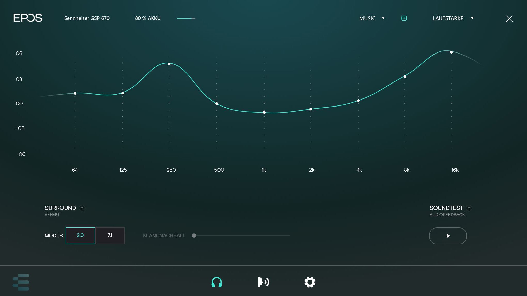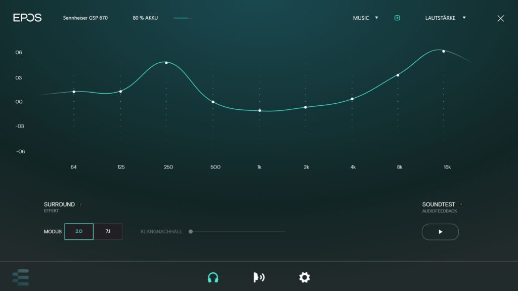 Beim ersten Öffnen eine positive Überraschung – die EPOS Gaming Suite wirkt unheimlich aufgeräumt, hat für meinen Geschmack ein schönes Design und bietet alles, was man braucht, ohne mit Funktionen überladen zu sein. Aufgeteilt ist das Ganze in drei Reitern, wovon sich zwei mit dem Sound des Kopfhörers und Mikrofons beschäftigen. Im ersten Reiter „Wiedergabe“ fällt direkt der große Equalizer ins Auge. Vier Profile legt EPOS vor: „Music“, „Esport“, „Movie“ und „Flat“. Letzteres bringt alle EQ-Bänder wieder auf 0 zurück. Neun Bänder stehen uns zum Eingriff zur Verfügung, die wir je um 6 dB erhöhen oder absenken können. Die drei Herstellervorgaben greifen dabei schon sehr stark in die Kurve ein und scheuen auch nicht davor zurück, eine oder mehrere Frequenzen um volle 6 dB zu pushen. Um die verschiedenen Möglichkeiten zu hören, ein guter Start, aber dann sollte man sich vielleicht doch wieder ins Profil „Flat“ begeben und selber an den Frequenzen schrauben. Ist man zufrieden, reicht ein Klick auf das „+“, um das eigene Profil zu speichern.
