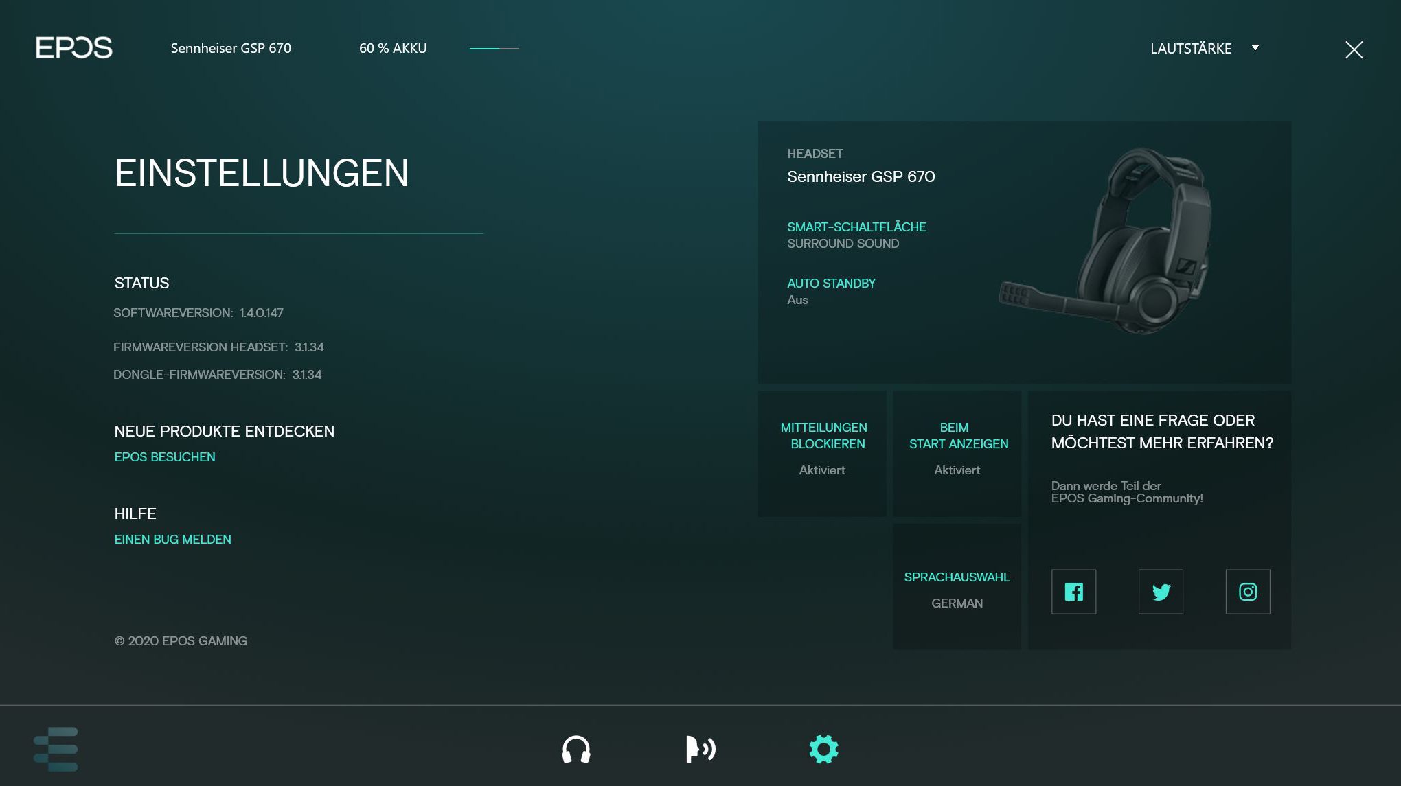 Der eigentliche Clou ist aber der mitgelieferte USB Dongle. Zwar sinkt die Akkuleistung über diese Verbindung um gut vier Stunden, die Vorteile für PC-Nutzer überwiegen allerdings. Zum einen ist bei dieser Variante die Übertragung verzögerungsfrei, was bei kompetitiven Spielen stets ein Muss ist. Des Weiteren bekommt man nur so den Zugang zur EPOS Gaming Suite, die Software, die wie immer alles besser machen soll, was ab Werk vielen von euch vielleicht noch nicht ganz den individuellen Geschmack treffen mag.