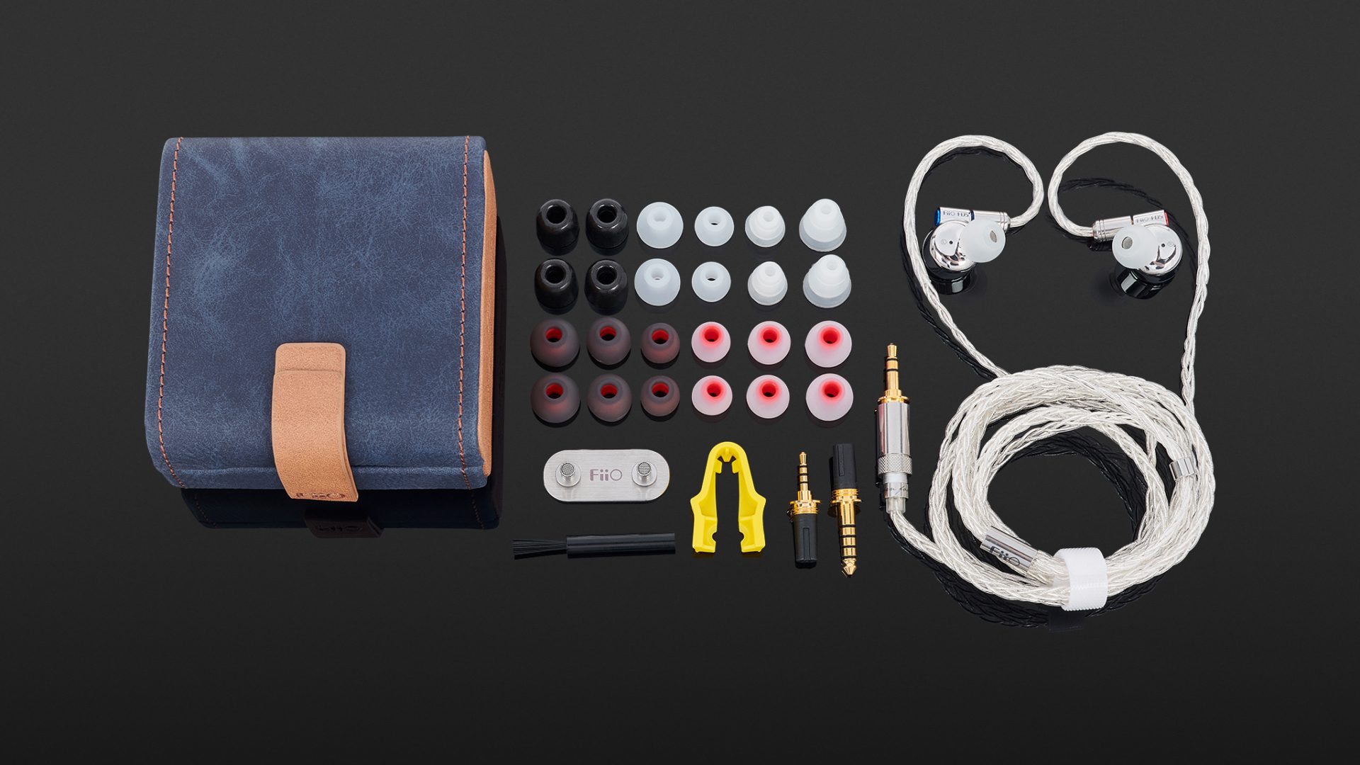 Ausgeliefert werden die In-Ear-Monitore in einer schicken Kartonschatulle mit umfangreichem Zubehör, das neben einer hochwertigen Aufbewahrungsbox aus Leder, einen Satz schmalere Sound Tubes, eine Reinigungsbürste, den MMCX Assist von Final sowie 13 Paare an Eartips umfasst. Bei den vormontierten, breiteren Sound Tubes stehen bass- und stimmbetonte sowie neutrale Silikon-Eartips in jeweils drei Größen (S/M/L) und zwei Schaumstoff-Varianten in M zur Auswahl. Für die schlankeren Wechselröhren empfiehlt FiiO hingegen die mitgelieferten Triple-Flange-Ohrpassstücke mit dem dünneren Schaft, welche jedoch lediglich in den Größen S und L vorliegen, was im Vergleich etwas dürftig erscheint.
