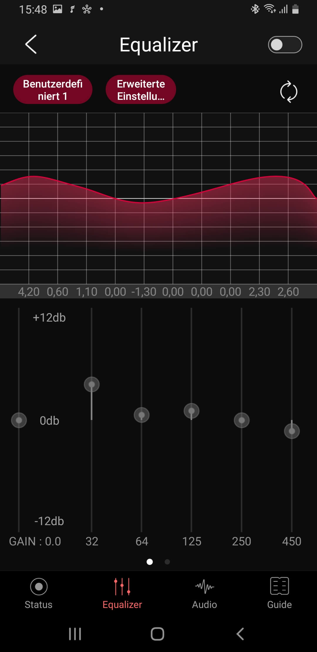 Meine Präferenz: 4 dB mehr Schub bei 64 und 2 dB bei 32 Hz, dann das 500-Hz-Band manuell auf 480 Hz setzen und dort um 2 dB reduzieren, hiernach bei 8 kHz einen kleinen Dip um 1 dB und schlussendlich das letzte Höhen-Band manuell auf die Einsatzfrequenz 14 kHz legen, den Q-Faktor auf sanfte 0,45 stellen und die Höhen um 4 dB anheben (Audioprofis werden wahrscheinlich schon erkannt haben, dass es sich hierbei um die klassische „Sweetening-Kurve“ handelt). Was die FW3 im Ergebnis deutlich muskulöser im Bass und brillanter in den Höhen macht und den Hörspaß entsprechend ankurbelt.