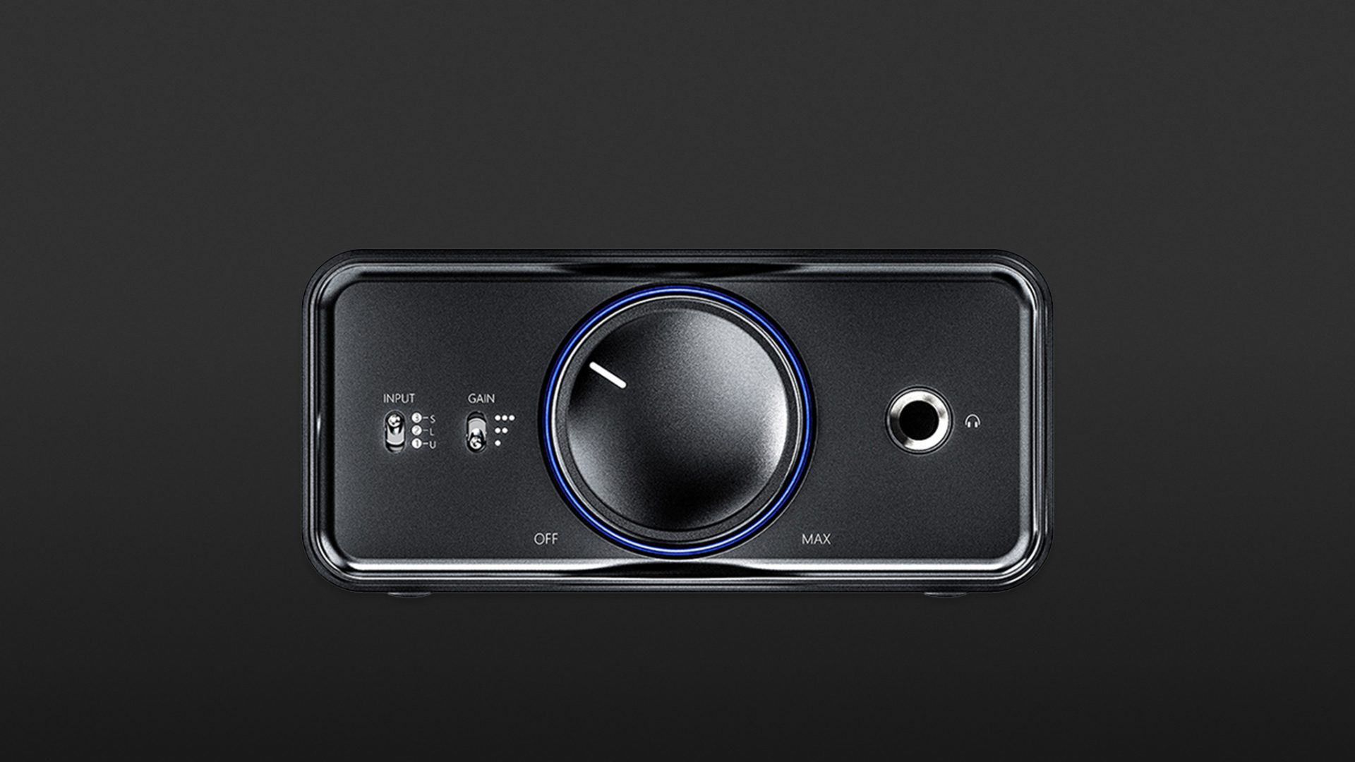 An der aufgeräumten Frontseite wird die Eingangsauswahl per Miniaturschalter getroffen (USB, Line, Koaxial), die dreistufige Vorverstärkung (0 dB, -6 dB, -10 dB) gewählt und mit dem übergroßen Regler die Lautstärke in Schritten von 0,5 dB festgelegt. Letztgenannter dient gleichzeitig als Ein- und Ausschalter. Ein 6,35-mm-Kopfhörerausgang rundet die Front ab.