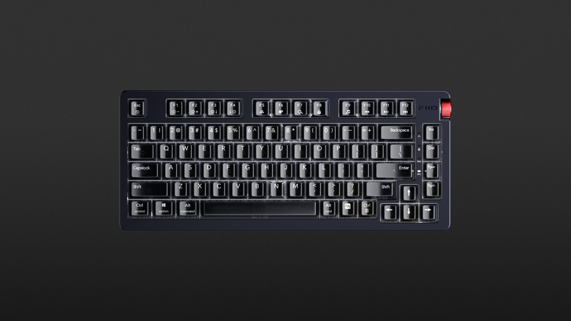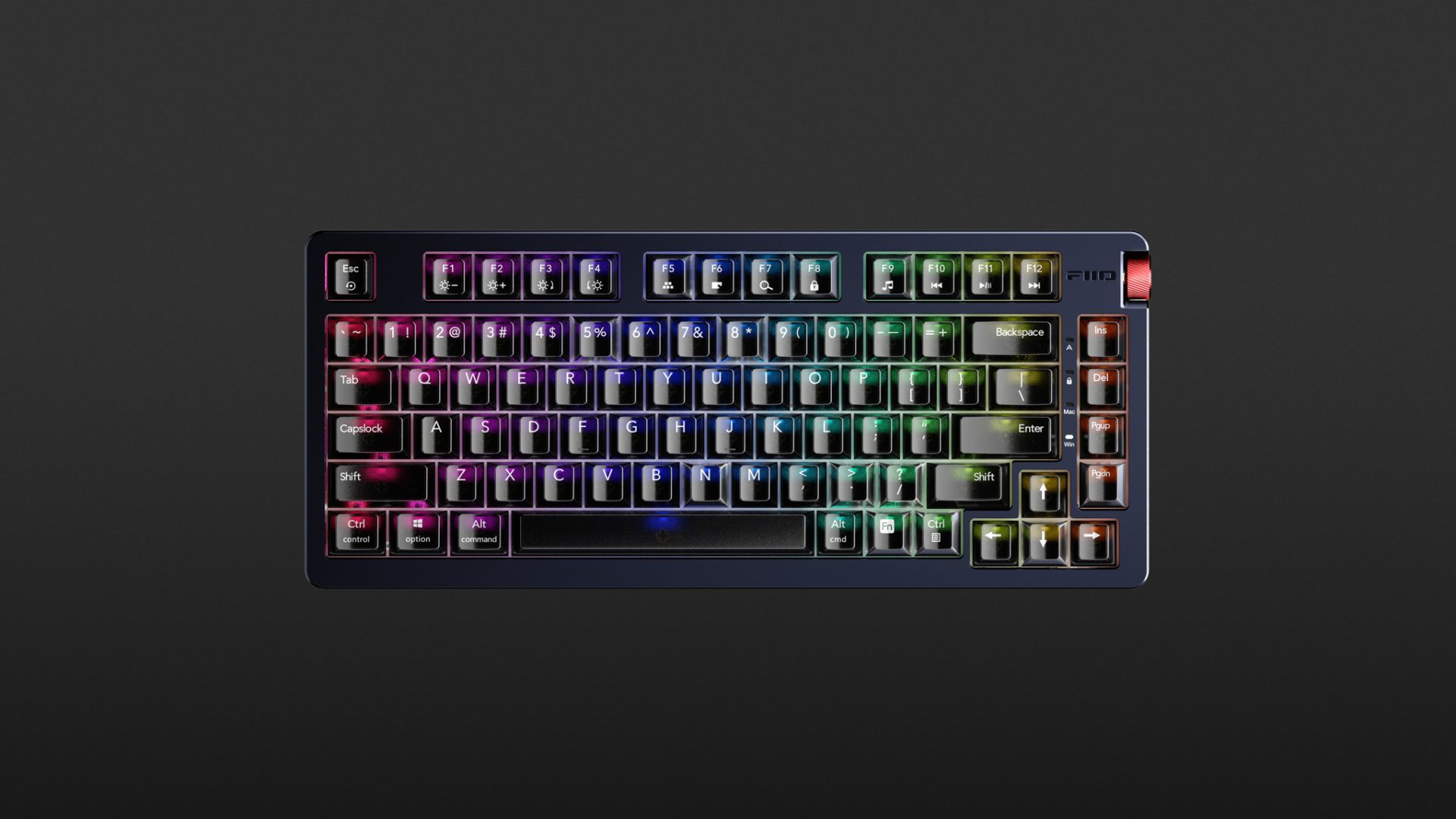 Die Tastatur bietet ein 75 %-Layout und ist damit nur marginal breiter als ein MacBook 14,2 Zoll. Das Gehäuse besteht aus einer Kombination aus Aluminium-Magnesium-Legierung und Kunststoff und ist sehr gut verarbeitet. Die RGB-LEDs sind anpassbar, während das rote Lautstärkerad aus Aluminium auch als Play/Pause-Taste dient. Mac User müssen zum Ändern der Beleuchtung übrigens in den Windows-Modus umschalten, damit die FN plus F1 bis F4 auch funktionieren. Dank unterschiedlicher Tastatur-Layouts (bei unserem Testgerät QWERTZ) und teils doppelt bedruckter Tasten ist die KB3 Windows- und Mac-kompatibel sowie Android und iOS kompatibel.
