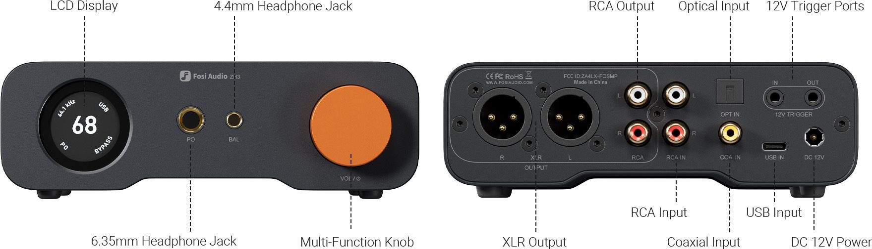 - Die Bedienelemente und die Anschlüsse des Fosi Audio ZH3