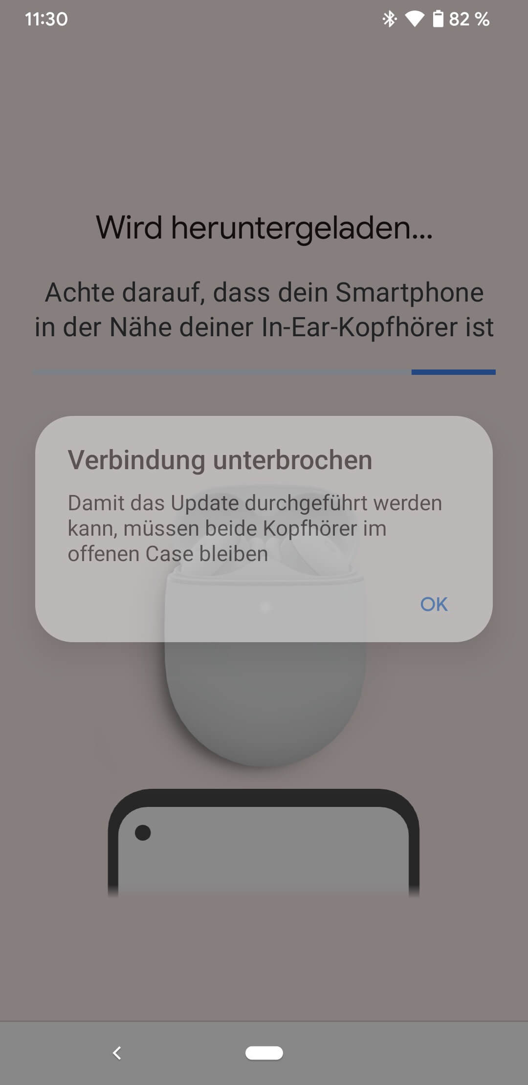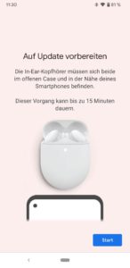 Leider scheiterte das Firmware-Update bei uns zunächst daran, dass die In-Ears trotz der Anweisungen seitens Google nicht erkannt wurden. Beide Hörer müssen im geöffneten Case unmittelbar neben dem Smartphone liegen. Hier zeigte sich, dass die Silikonflügel dafür sorgten, dass die Pins keinen Kontakt herstellen konnten. Mit einem Klebeband zur Fixierung ließ sich dieses Kontaktproblem allerdings problemlos lösen.