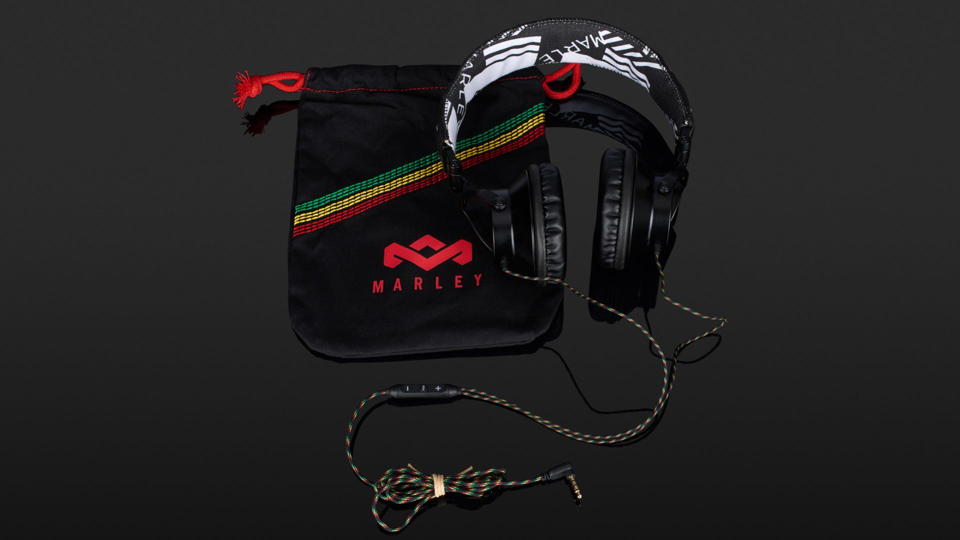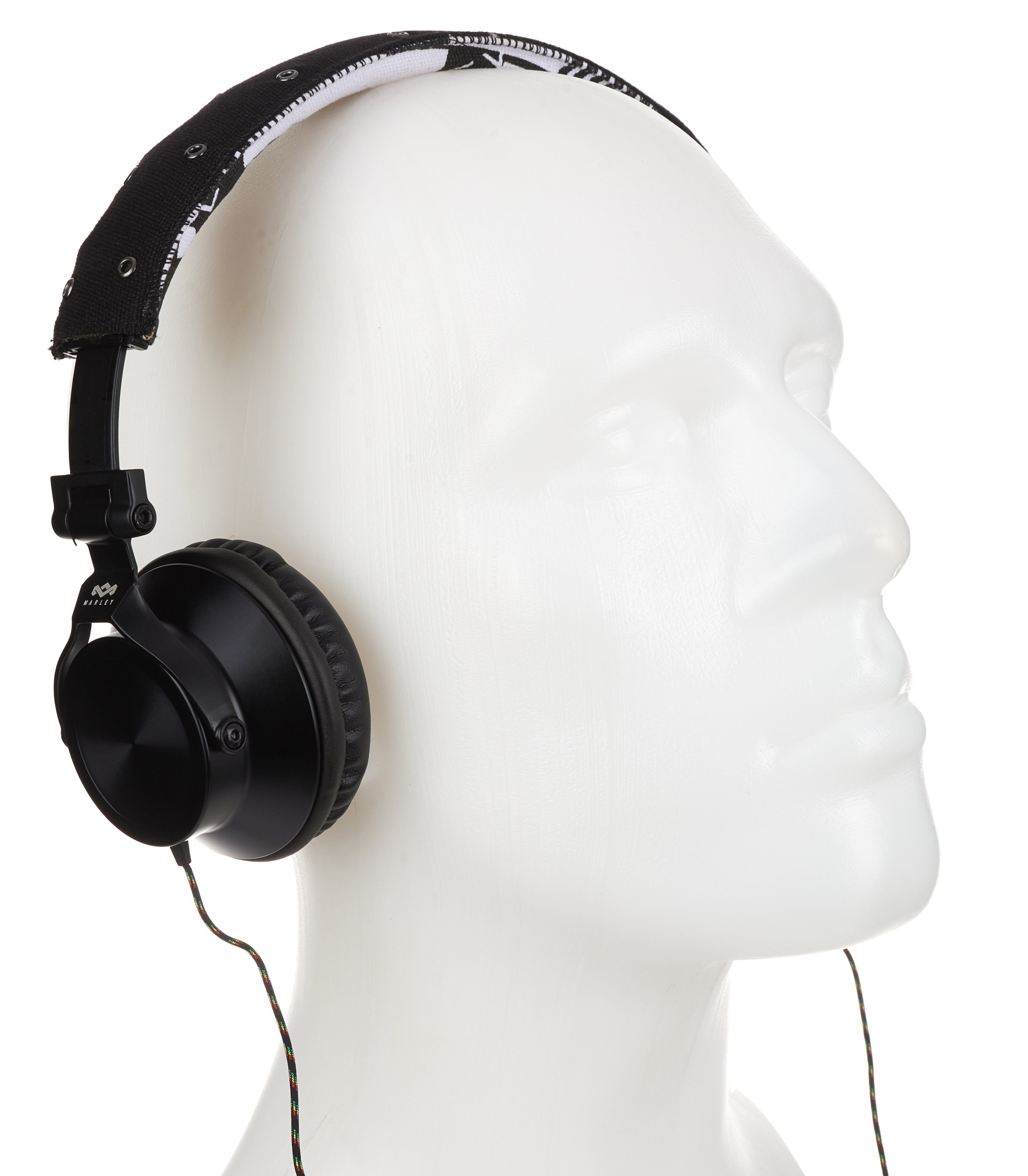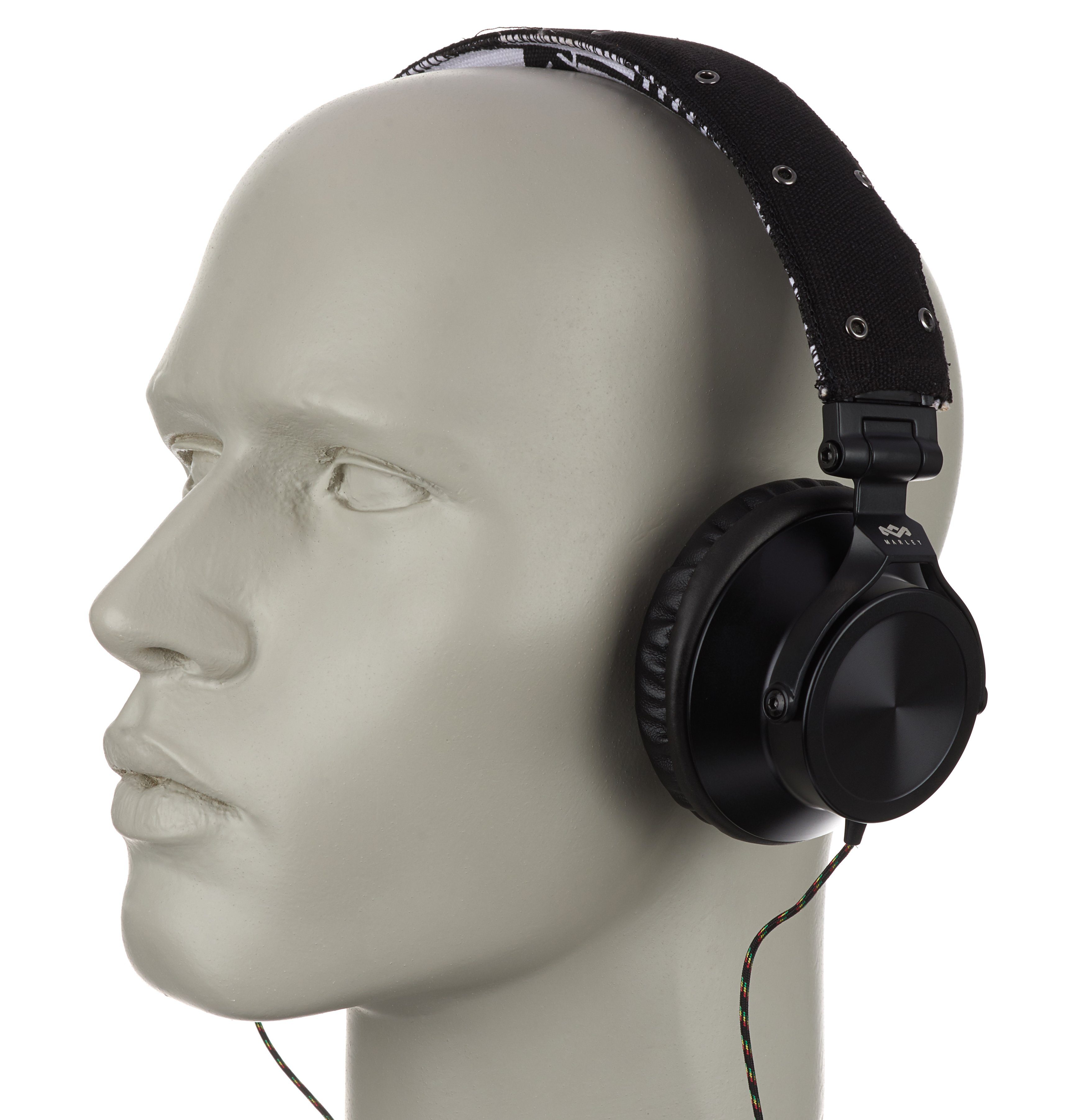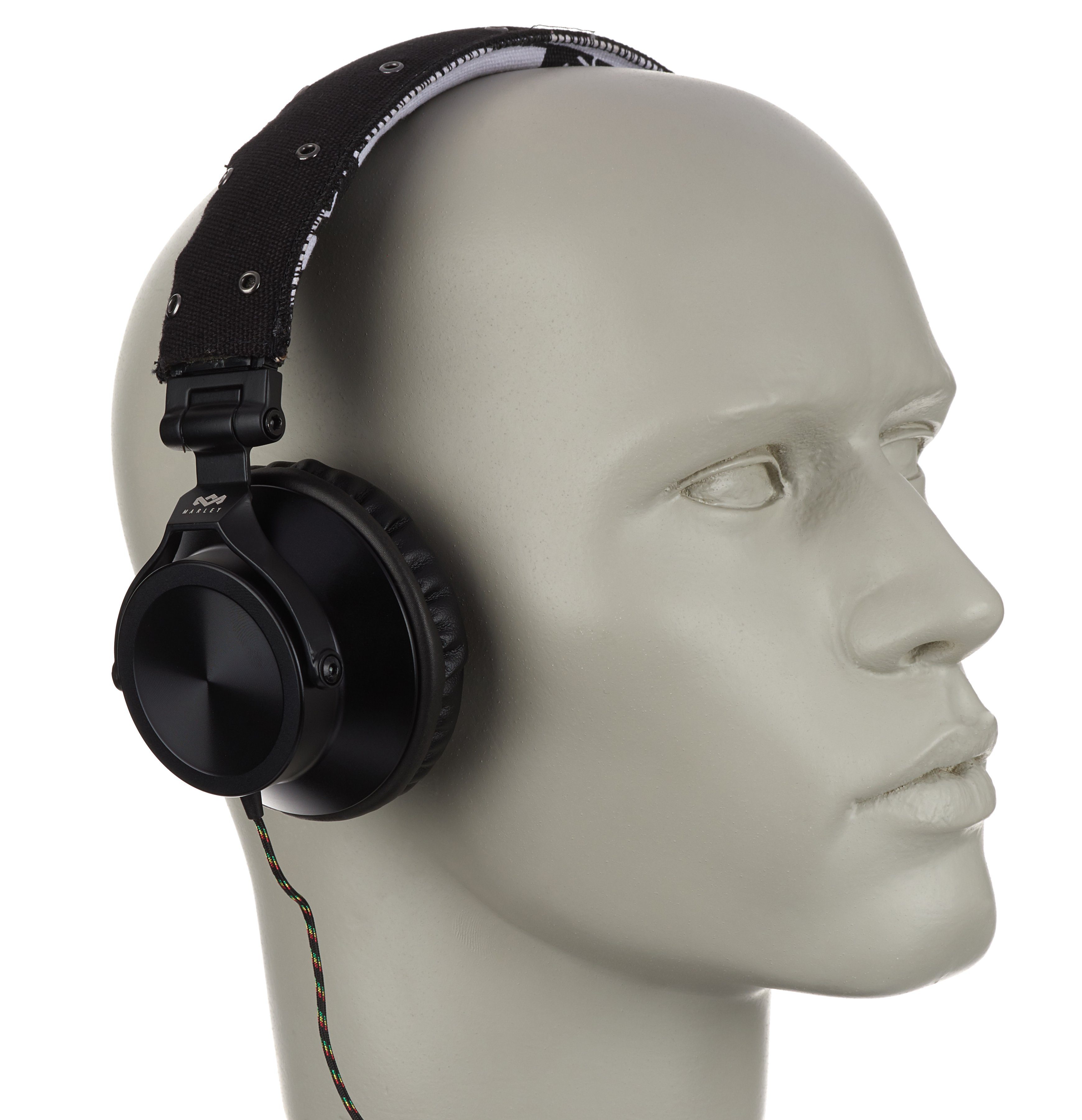 Das Produkt beginnt mit der Verpackung, und die gibt bis auf „40-Millimeter-Treiber“ keinerlei Infos zu den technischen Spezifikationen preis. Der Hörer ist ein ohraufliegendes Modell mit dynamischem Wandlerprinzip und 16 Ohm Impedanz. Das beidseitig geführte, Reggaefarben stoffummantelte, dünne Kabel trifft nach etwa 30 Zentimetern auf die Fernbedienung und endet nach 1,5 Metern in einem Winkelstecker. Bügel, Gondelgabel und Chassis sind aus teils etwas kantigem Metall gefertigt, die Gelenke etwas schwerfällig. Der Ohrbeschaller lässt sich zum Transport in der mitgelieferten Bekenner-Tasche zusammenfalten. Mit 30 Millimetern Extralänge pro Seite – das ausziehbare Rasterband sitzt in einer Kunststoffschiene – ist der Marley nichts für Dickköpfe. Hat der 247 Gramm schwere Proband auf dem Haupt Platz genommen, sitz er dort ziemlich fest, für meinen Geschmack übt er jedoch einen zu hohen Anpressdruck aus, um auf Dauer damit glücklich zu sein. Der Leinenbügel ist obendrein nicht sonderlich stark gepolstert. Die Kante ist hart. Damit möchte ich, um den Hals gehangen, im Flieger nicht einnicken.