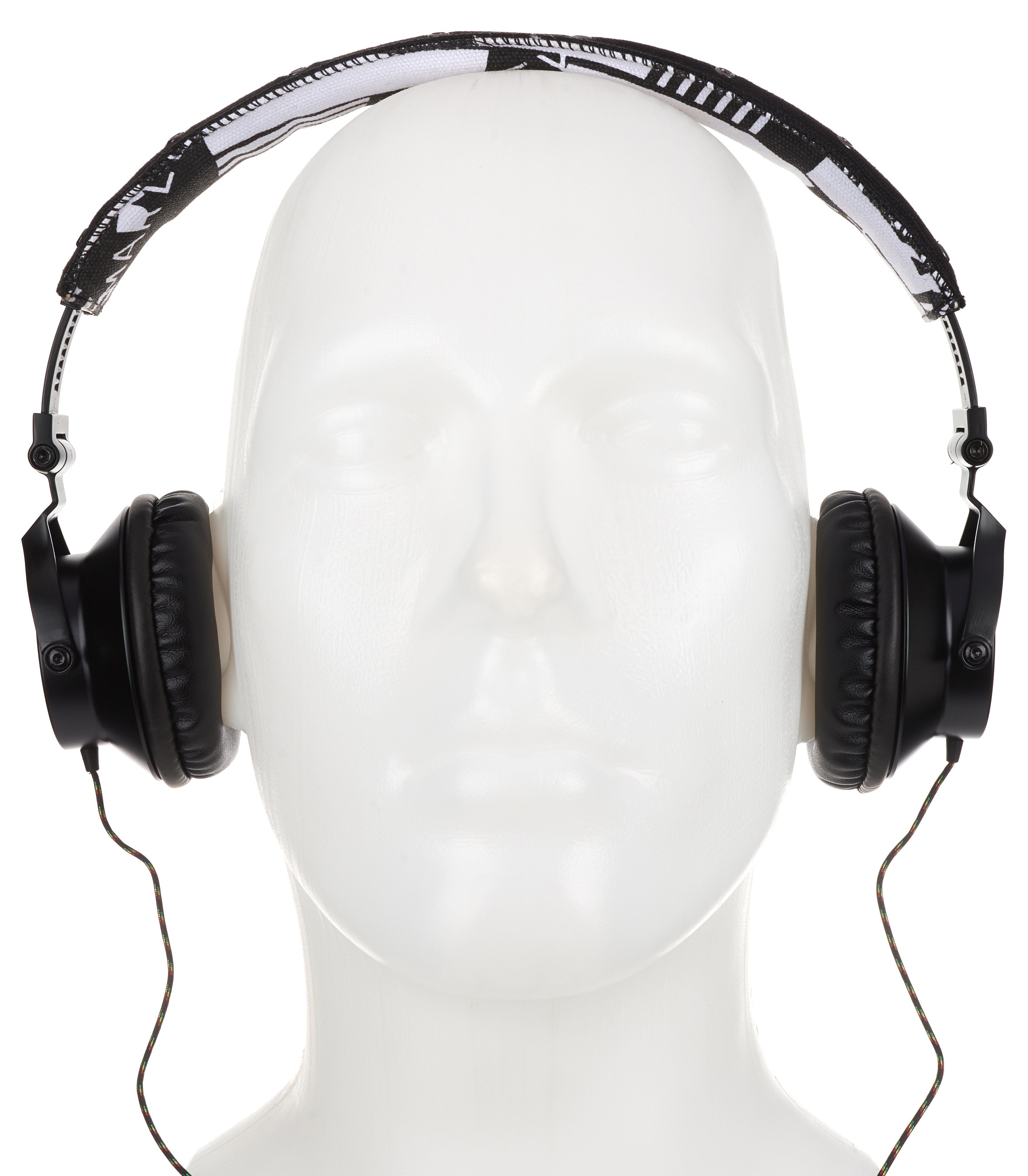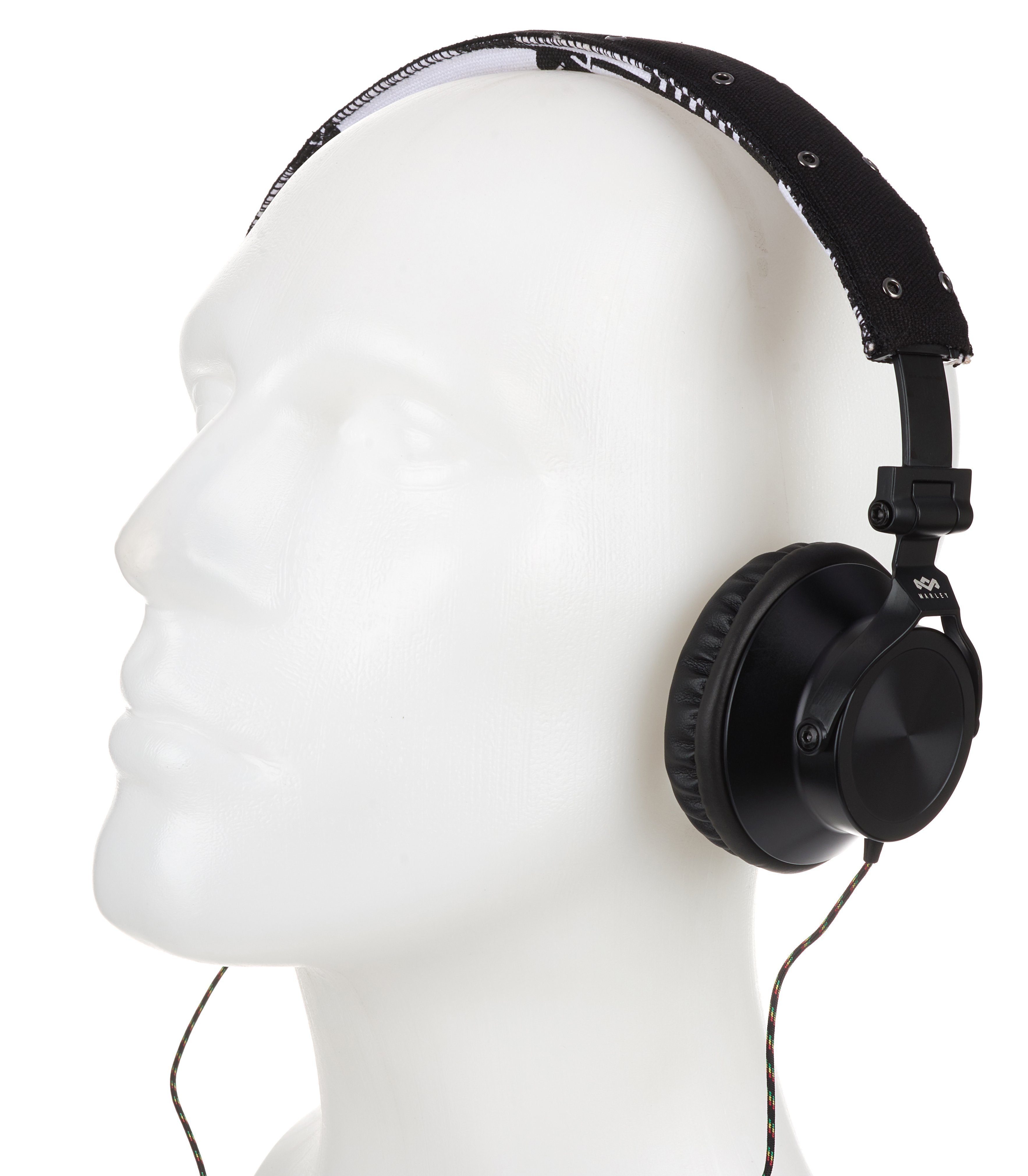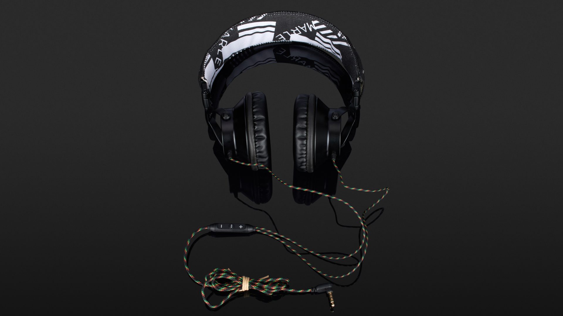 Das Produkt beginnt mit der Verpackung, und die gibt bis auf „40-Millimeter-Treiber“ keinerlei Infos zu den technischen Spezifikationen preis. Der Hörer ist ein ohraufliegendes Modell mit dynamischem Wandlerprinzip und 16 Ohm Impedanz. Das beidseitig geführte, Reggaefarben stoffummantelte, dünne Kabel trifft nach etwa 30 Zentimetern auf die Fernbedienung und endet nach 1,5 Metern in einem Winkelstecker. Bügel, Gondelgabel und Chassis sind aus teils etwas kantigem Metall gefertigt, die Gelenke etwas schwerfällig. Der Ohrbeschaller lässt sich zum Transport in der mitgelieferten Bekenner-Tasche zusammenfalten. Mit 30 Millimetern Extralänge pro Seite – das ausziehbare Rasterband sitzt in einer Kunststoffschiene – ist der Marley nichts für Dickköpfe. Hat der 247 Gramm schwere Proband auf dem Haupt Platz genommen, sitz er dort ziemlich fest, für meinen Geschmack übt er jedoch einen zu hohen Anpressdruck aus, um auf Dauer damit glücklich zu sein. Der Leinenbügel ist obendrein nicht sonderlich stark gepolstert. Die Kante ist hart. Damit möchte ich, um den Hals gehangen, im Flieger nicht einnicken.