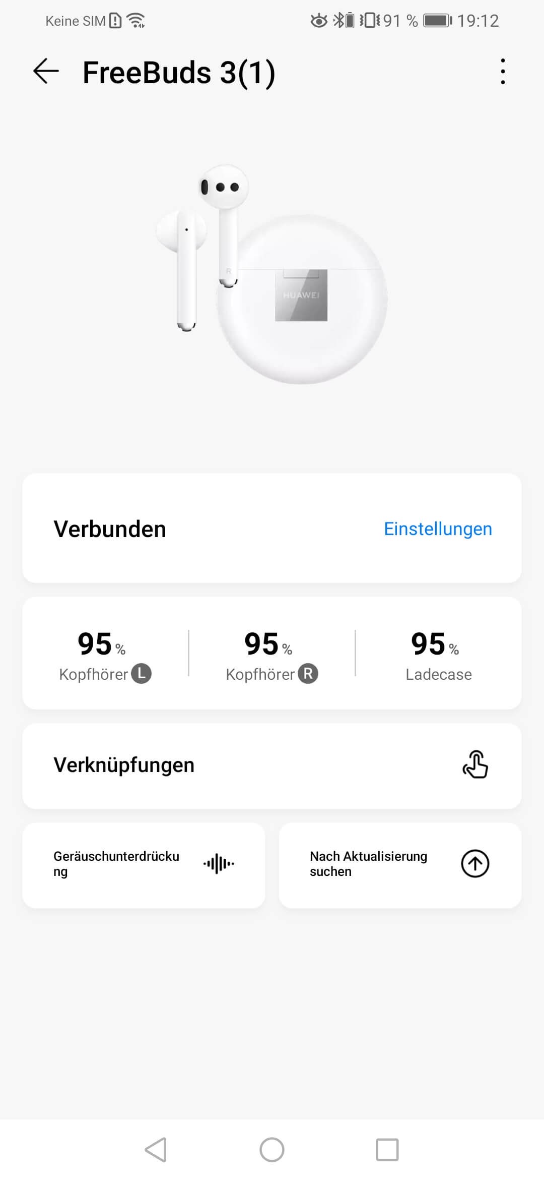 In Verbindung mit einem Huawei Phone verbinden sich die FreeBuds 3 ähnlich elegant und schnell, wie man es aus dem Hause Apple kennt: Einfach nur den Deckel des Ladecase öffnen, woraufhin ein kleines Fenster auf dem Phone aufpoppt, den Vollzug der Verbindung anzeigt und die jeweiligen Akkustände der Kopfhörer und der Ladebox darstellt. Das klappt allerdings nur mit hauseigenen Smartphones, die mindestens EMUI 10 installiert haben. Das trifft übrigens auch auf die Auto-Play-Funktion zu, die die Wiedergabe startet, wenn man die Kopfhörer in die Ohren steckt und automatisch pausiert, wenn die FreeBuds 3 wieder herausgenommen werden.