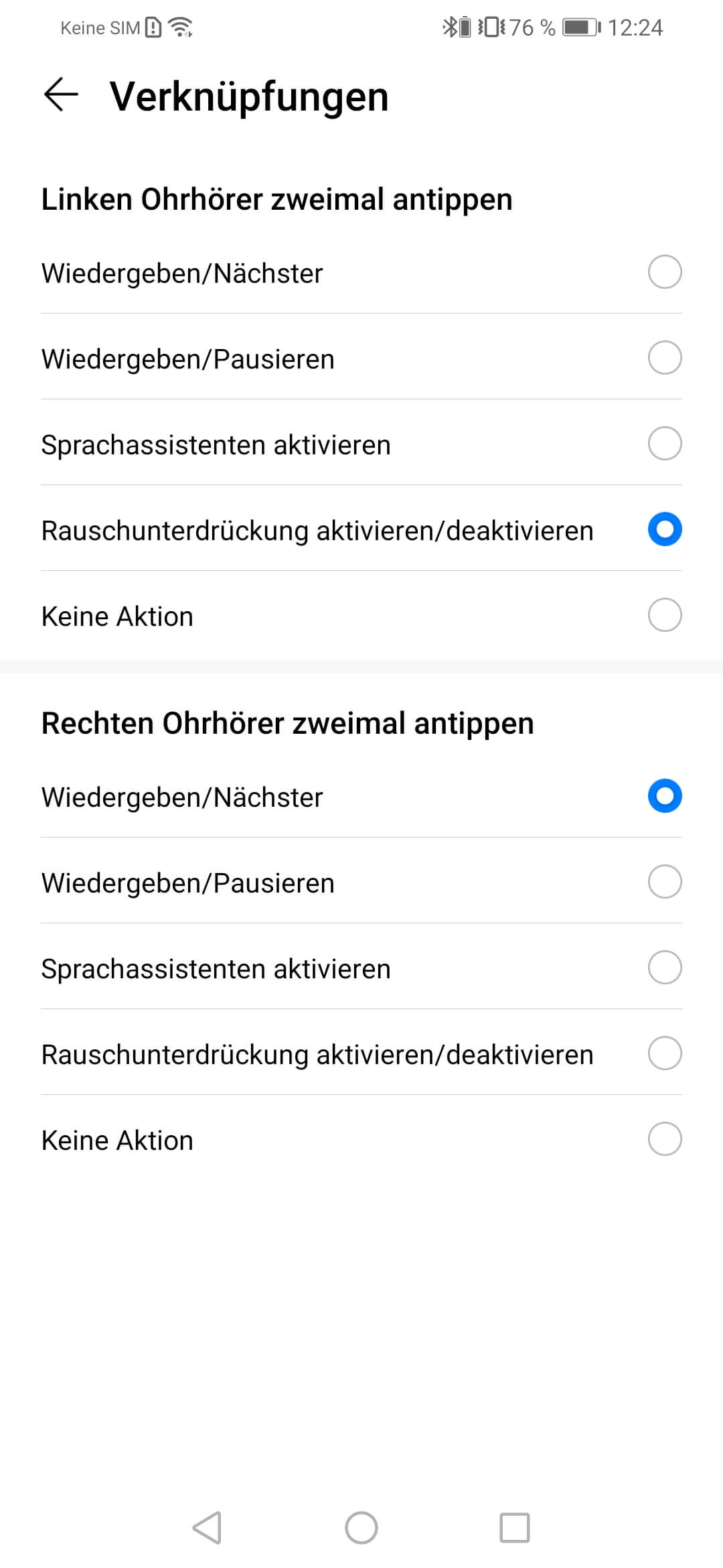 Sofern die kostenlose Android App „Huawei AI Life“ installiert ist, können die In-Ears entsprechend den eigenen Wünschen mit Funktionen belegt werden: Unter dem Punkt „Verknüpfung“ kann man festlegen, was man mit dem zweimaligen Antippen des rechten bzw. linken Kopfhörers fernsteuern kann, als da wären: „Skip Forward“, „Play/Pause“, „Assistent“, „ANC“ sowie „keine Aktion“. Es gibt also nur zwei Aktionen, die direkt am Kopfhörer gesteuert werden können. Des weiteren kann noch die aktive Geräuschunterdrückung justiert werden, doch dazu später mehr.