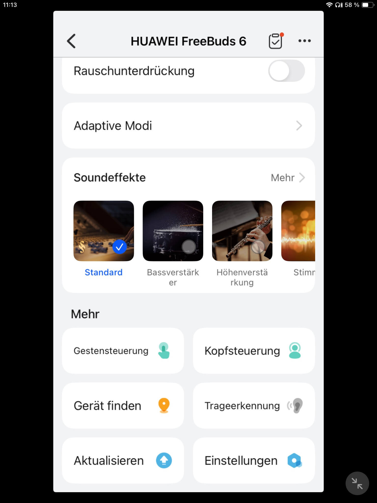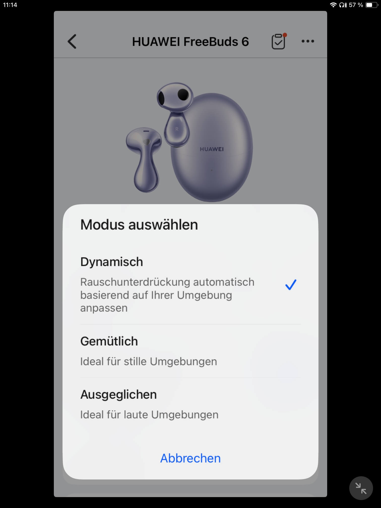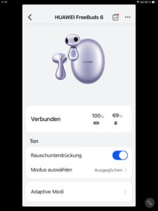 Über die App-Anbindung (iOS und Android per AppGallery oder als APK-Datei von der Huawei Homepage) der Huawei FreeBuds 6 stehen drei ANC-Modi zur Auswahl: eine adaptive Variante, die sich selbstständig an das Umfeld anpasst, und zwei statische Betriebsarten, entweder für eine ruhigere oder eine lautere Umgebung.