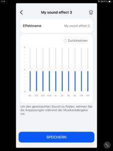 Die Klangregelung umfasst mit „Bassverstärkung“, „Höhenverstärkung“, „Stimmen“, „Sinfonie“ und „Hi-Fi Live“ fünf Voreinstellungen plus einen 10-Band-EQ für eigene Anpassungen, wobei bis zu drei Presets gespeichert werden können. Ergänzend lässt sich noch eine adaptive Lautstärkeanpassung zuschalten.