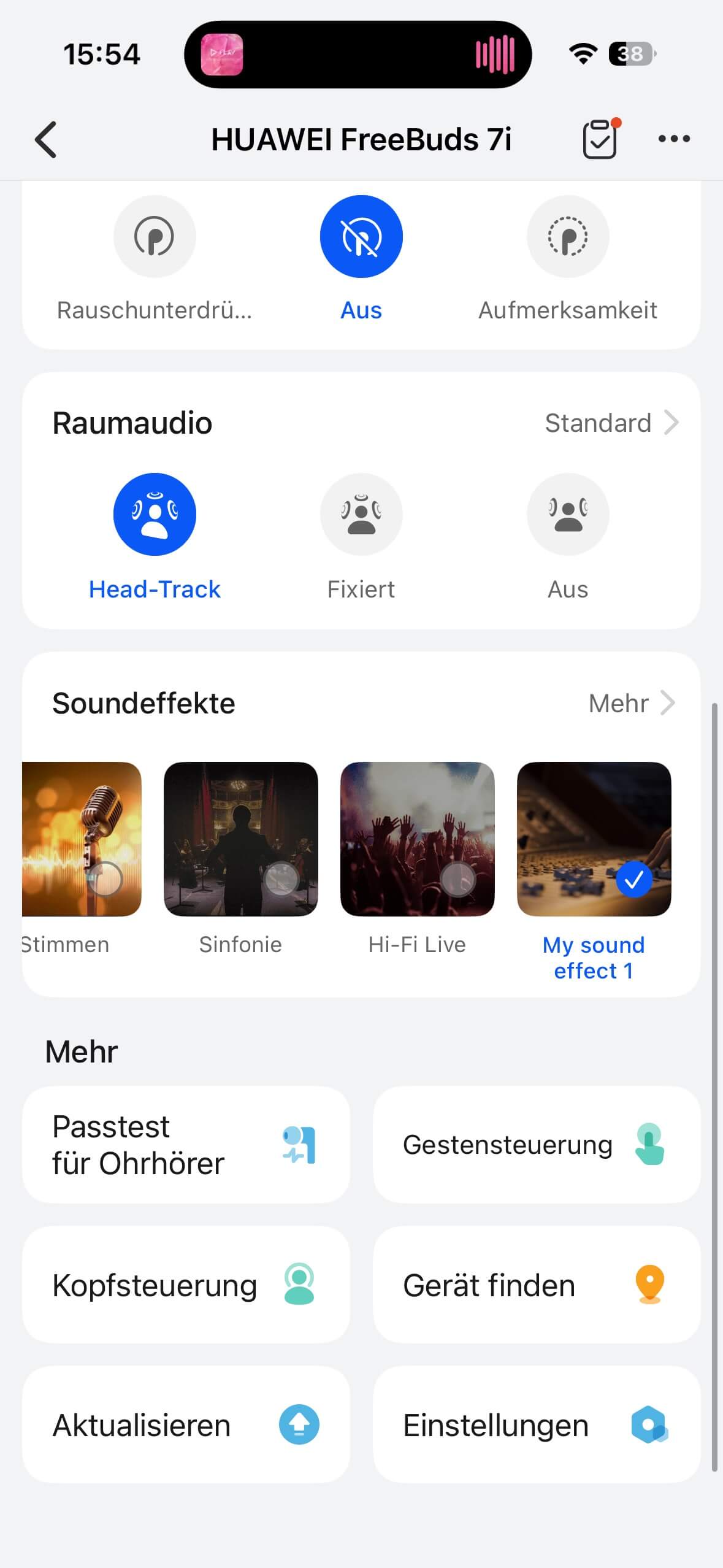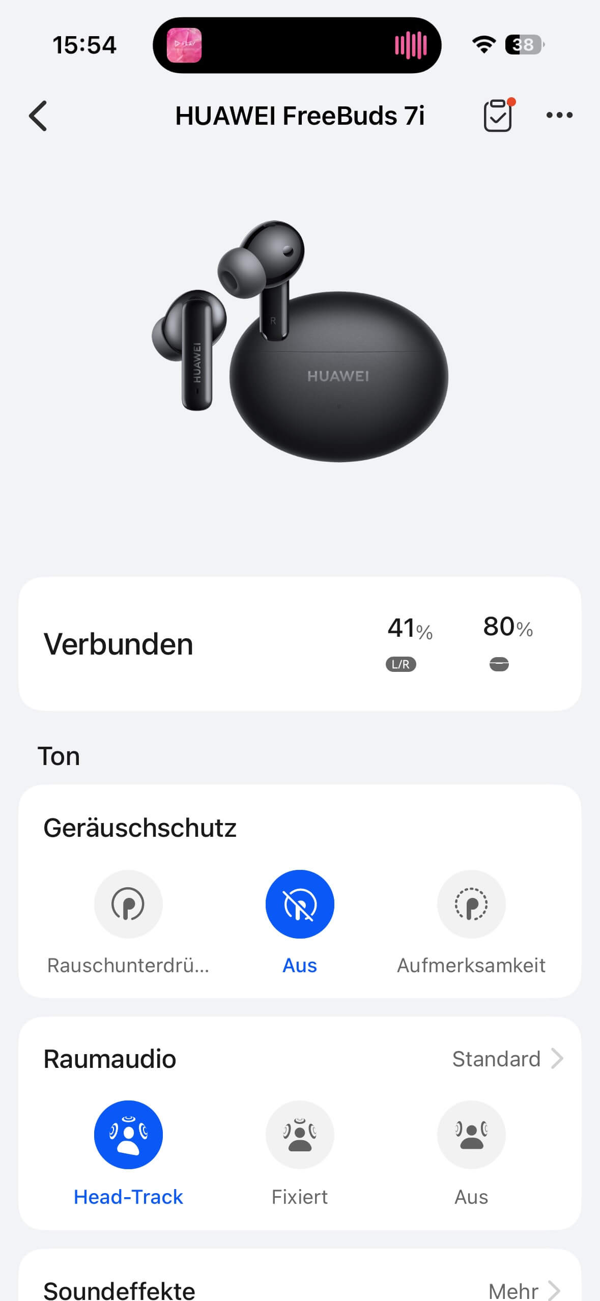 Das Headtracking läuft bei den Huawei FreeBuds 7i nicht rund. Es fängt meistens gut an, bleibt dann aber bei schnelleren Kopfbewegungen gerne mal stecken, sodass die Musik ungewöhnlich lange auf einer Seite vom Kopf verharrt, bis sie wieder zur Mitte wandert. Schade, denn ich bin ein Fan dieser Funktion.
