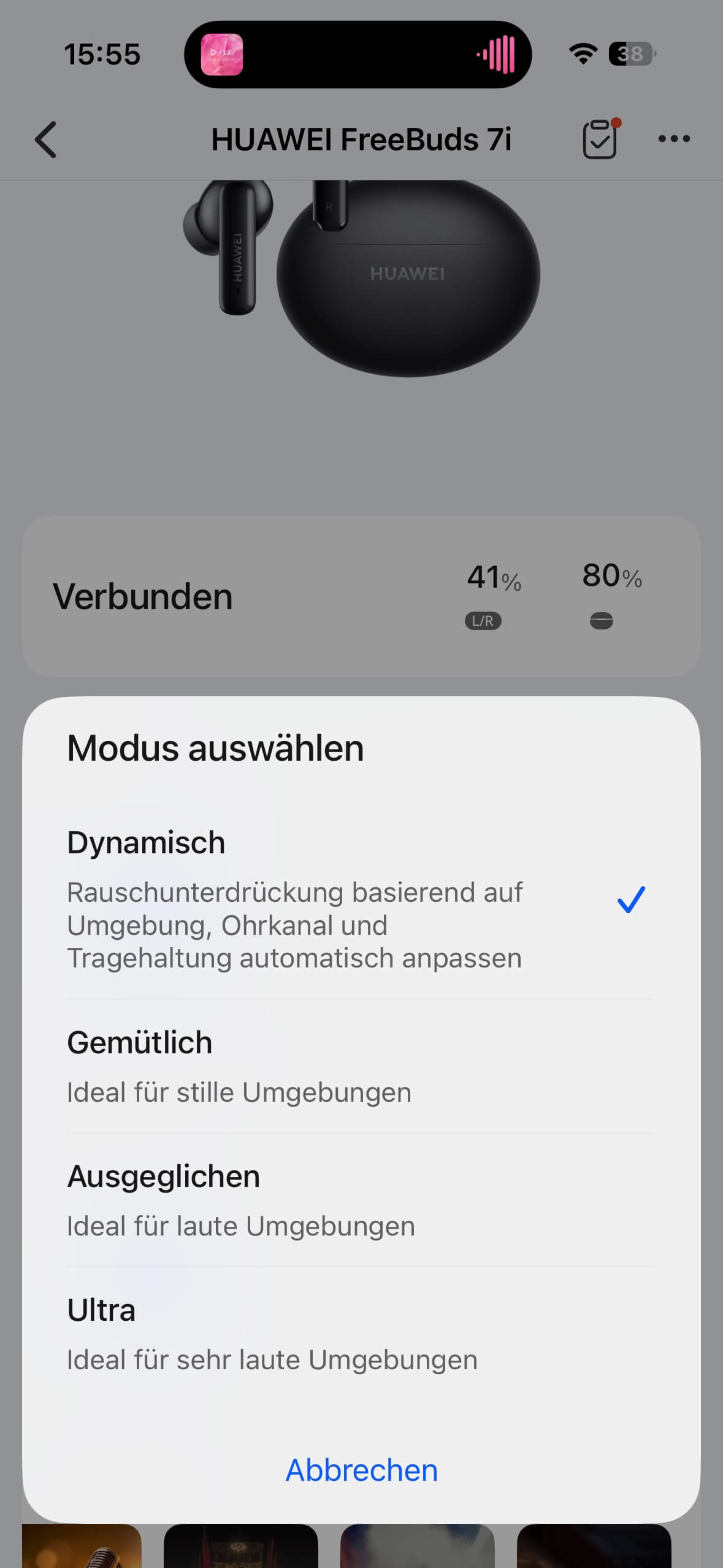 Das intelligent-dynamische ANC 4.0 der Huawei FreeBuds 7i packt ordentlich zu und sorgt für eine deutliche Reduzierung von Außenlärm. Gerade (oder wie immer) die mittleren und tiefen Frequenzen erfahren eine intensive Auslöschung und von den Geräuschen der Autos auf der Straße gelangen fast nur die Abrollgeräusche der Autoreifen zu den Ohren, die sich hin und wieder unter einer Taucherglocke wähnen. Spitze und kreischende Attacken wie das Abwerfen von Gabeln in die Besteckschublade oder das Einfahren der Straßenbahn in eine schlecht geschliffene Kurve dringen durch. Das Rauschen der Entlüftungsanlage oder das der Autobahn in der Ferne hingegen verschwindet beinahe völlig. Alles in allem wirkt das ANC der Huawei 7i gut bis sehr gut und verändert nichts bis wenig am grundsätzlichen Sound, wenn es aktiviert ist.