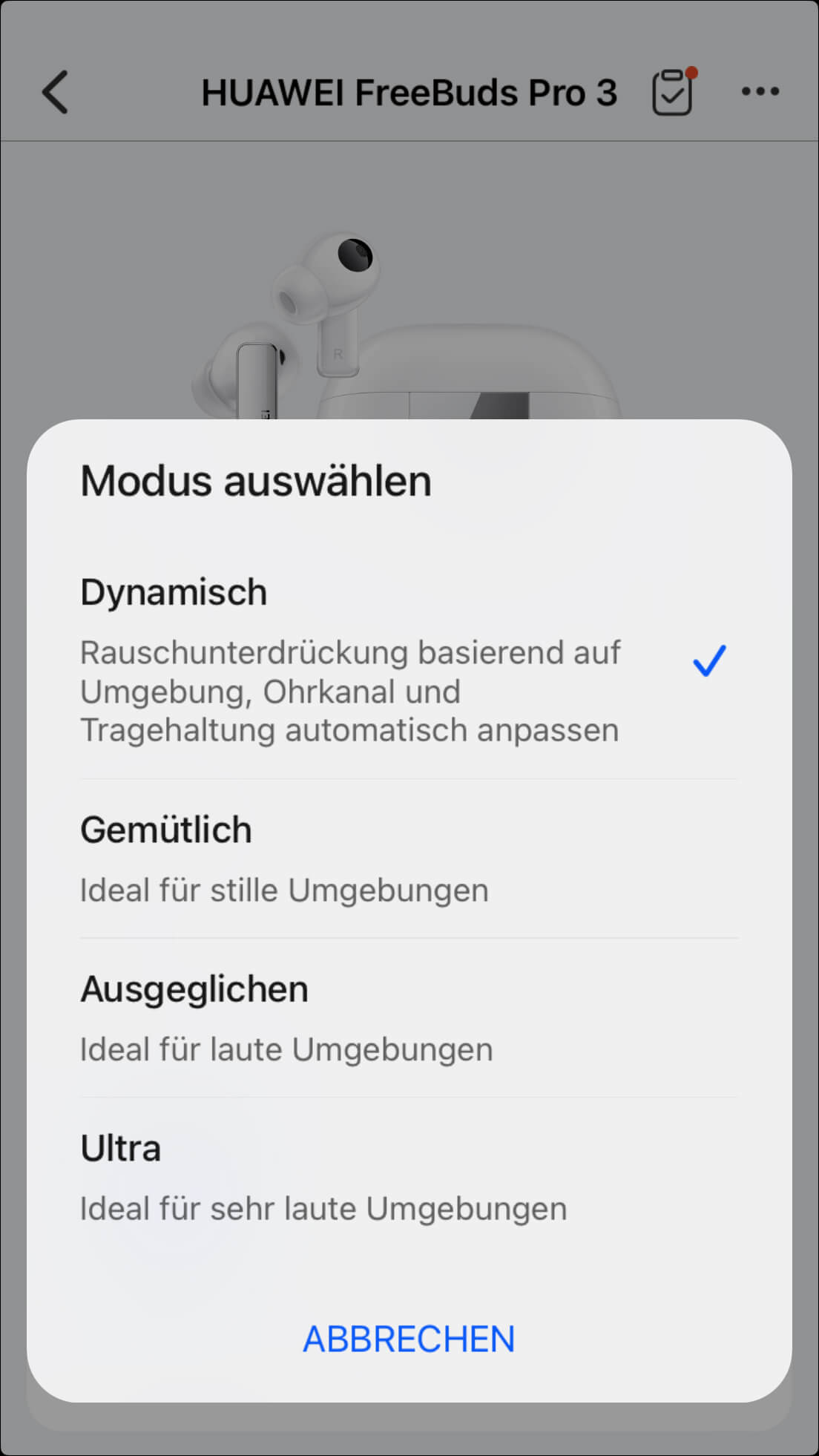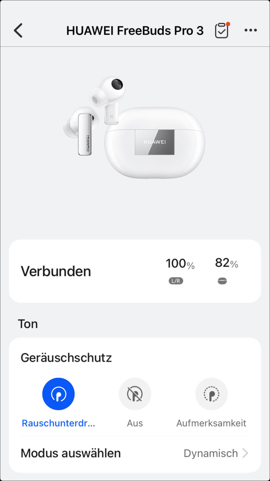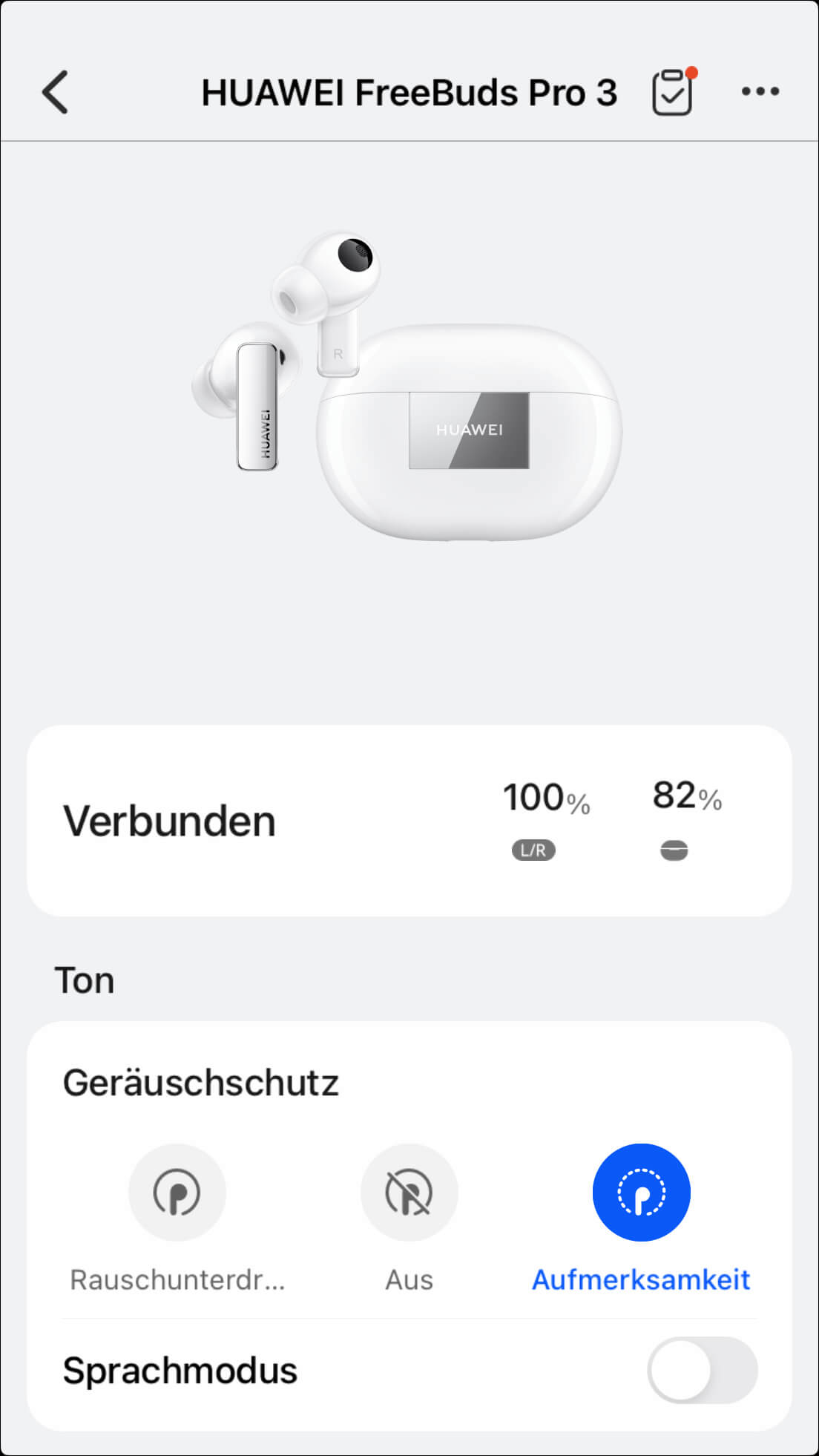 Über die Umgebungsgeräuschkontrolle der App-Anbindung (iOS und Android per AppGallery oder als APK-Datei von der Huawei Homepage) stehen mit „Gering“, „Ausgeglichen“ sowie „Ultra“ drei statische ANC-Modi und mit „Dynamisch“ eine adaptive Betriebsart zur Auswahl, die sich automatisch an die Umgebung, den Ohrkanal und die Tragehaltung anpassen soll. Bei der Verstärkung an Außengeräuschen wird dagegen zwischen einem allgemeinen Umgebungs- und einem speziellen Sprachmodus unterschieden. Eine Einstellung der Intensität ist dagegen nicht möglich.