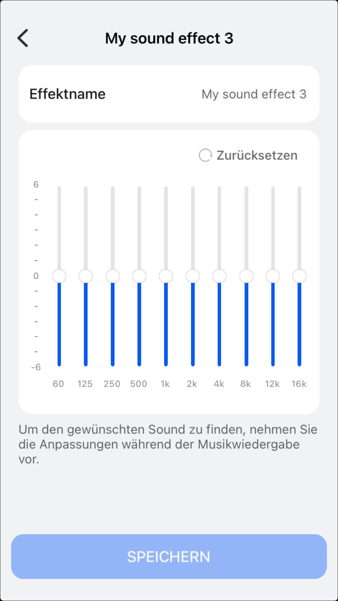 Darüber hinaus stellt die App eine Klangregelung zur Verfügung, die über den Grundmodus hinaus mit „Bassverstärkung“, „Höhenverstärkung“, „Stimmen“, „Sinfonie“ und „Hi-Fi Live“ fünf vorkonfigurierte Settings anbietet. Zudem besteht über einen EQ mit zehn Bändern die Option, eigene Einstellungen vorzunehmen, die als Presets speicherbar sind.