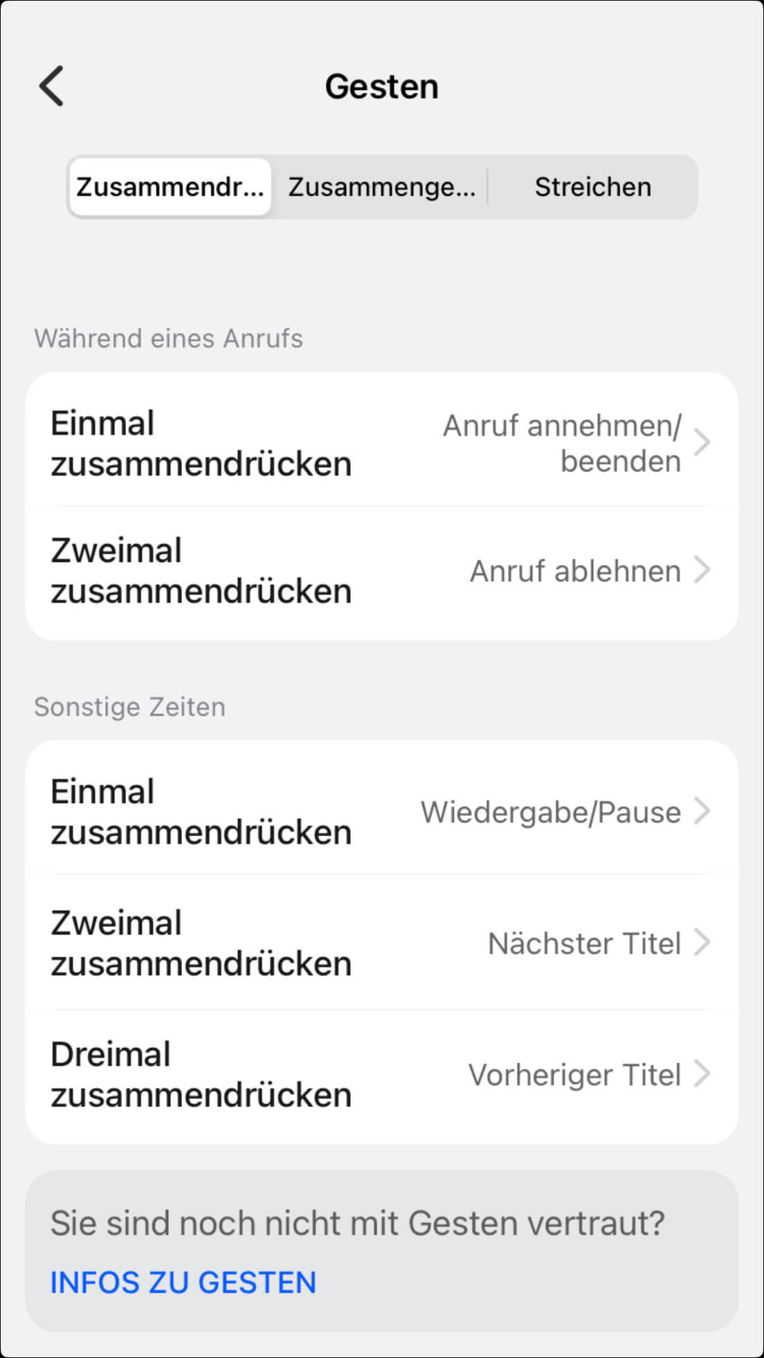 Über den drucksensitiven Bereich an den Stielen der kabellosen In-Ears lässt sich die Wiedergabe steuern, zur Titelauswahl vor- oder zurückspringen und die Lautstärke regeln. Darüber hinaus kann ein Umschalten zwischen ANC-, Umgebungs- und Grundmodus sowie das Annehmen und Beenden von Telefonaten erfolgen. Nicht vorgesehen ist hingegen ein manuelles Ein- und Ausschalten der Hörer, wodurch das Case stets benötigt wird. Auch eine individuelle Anpassungsmöglichkeit der Steuerung kann vermisst werden.