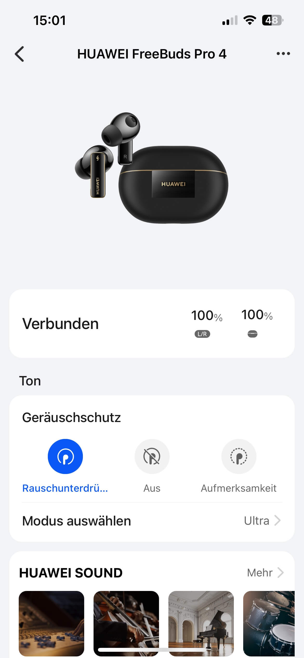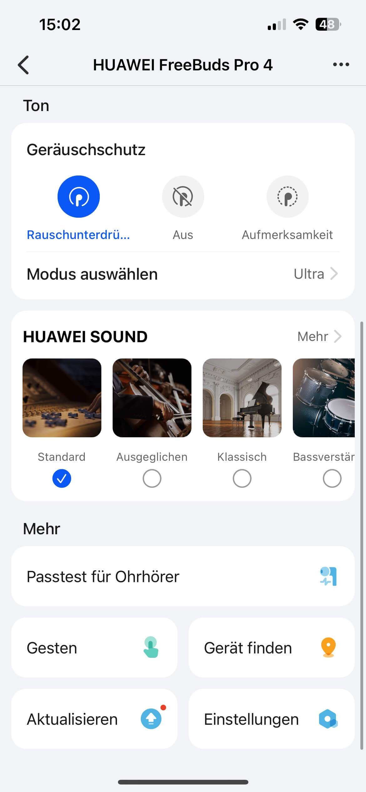 Die Steuerung via In-Ears lässt sich hier aber wie bei ihren Vorgängern (Huawei FreeBuds Pro 3) zwar ändern, eine individuelle Anpassungsmöglichkeit der Steuerung kann so detailliert aber nicht umgesetzt werden. Wer hier speziell nach Konfigurationswundern sucht, sollte sich mal das Kopfhörer-Portfolio auf unserer Seite von LG sowie Edifier näher ansehen.