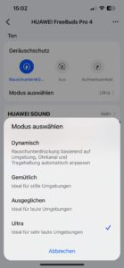 Das Grundrauschen hat Huawei sehr gut im Griff. Es ist wahrnehmbar, je nach gewähltem ANC-Modi hört man aber nur bei Stille wesentliche Unterschiede. Auch hier hat das Preset „Ultra“ die Nase vorne.