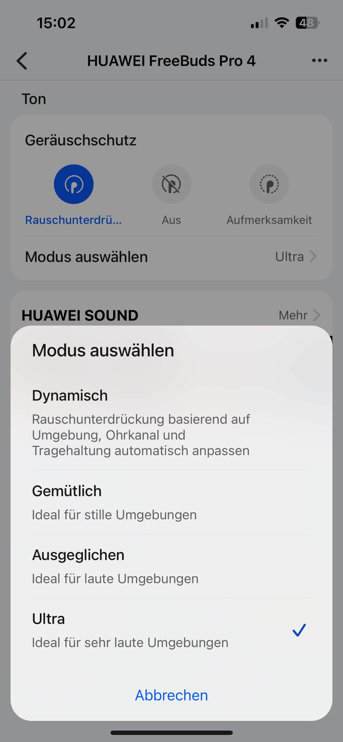 Die adaptive Geräuschunterdrückung der FreeBuds Pro 4 passt sich automatisch an die Umgebungsgeräusche an – wenn ihr es wollt. Denn Huawei hat seinem Top-Modell gleich vier Modi verpasst: