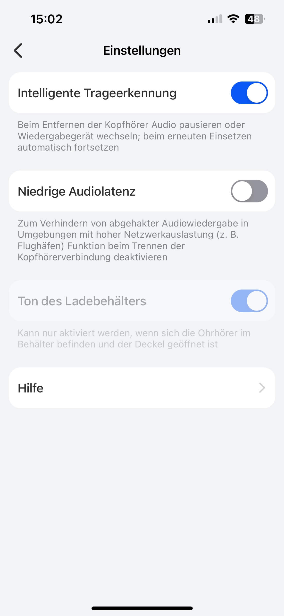 Damit wären die wichtigsten Funktionen beschrieben, wobei natürlich ein Ohrstöpselpasstest, die Möglichkeit Firmware-Updates zu fahren, eine Finden-Funktion für In-Ears und Case, ein Low-Latency-Modus für Spiele und Filme sowie das schaltbare Auto-Pausen-Feature nicht fehlen. Einzig vermissen wir die Möglichkeit, die Statustöne sowie die etwas gelangweilt klingende weibliche Stimme zu deaktivieren.