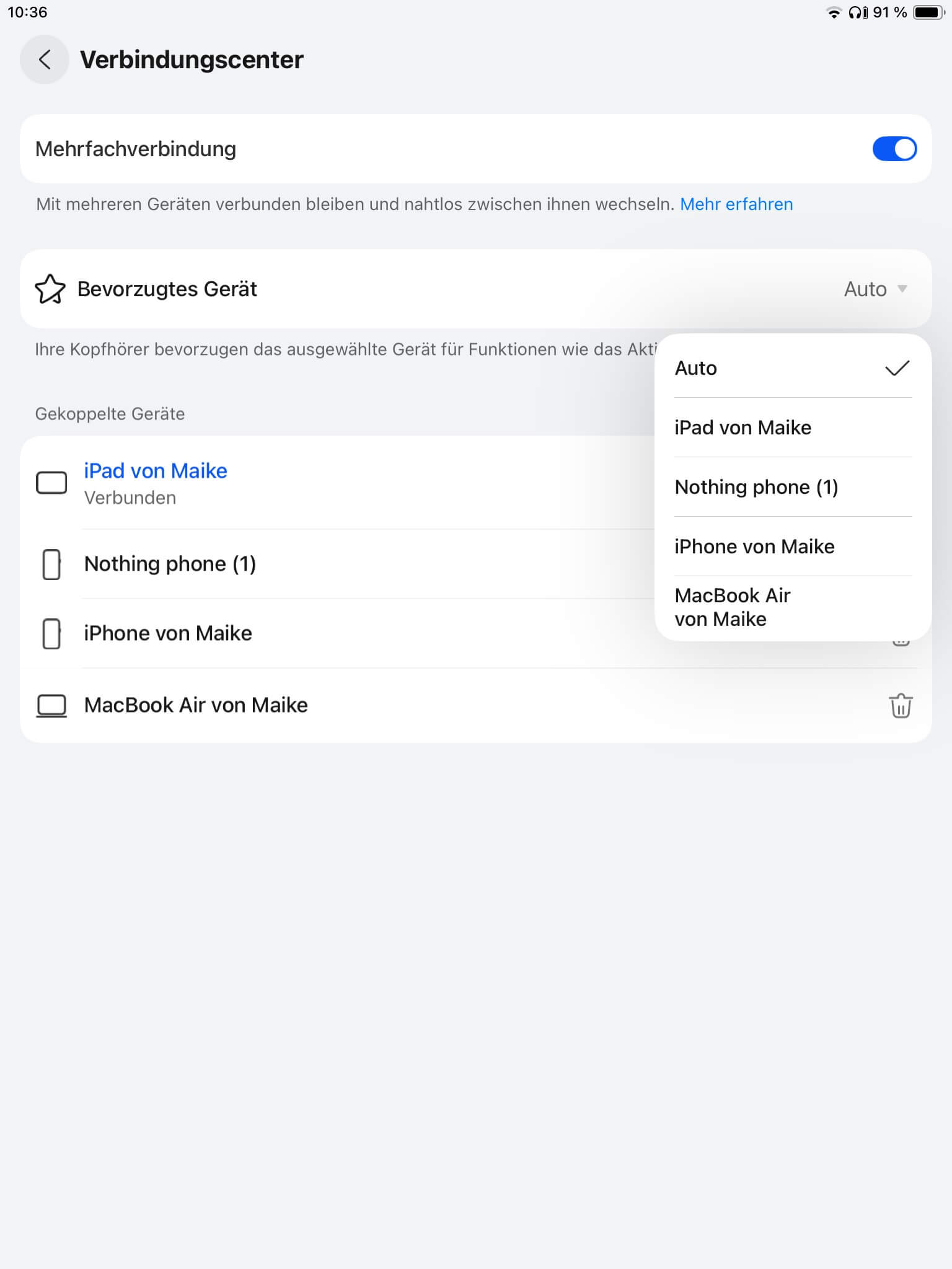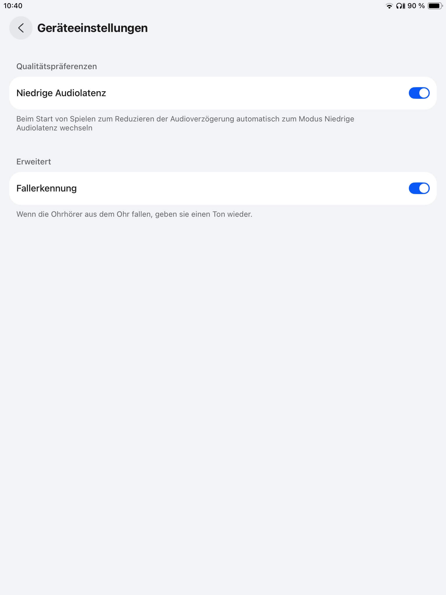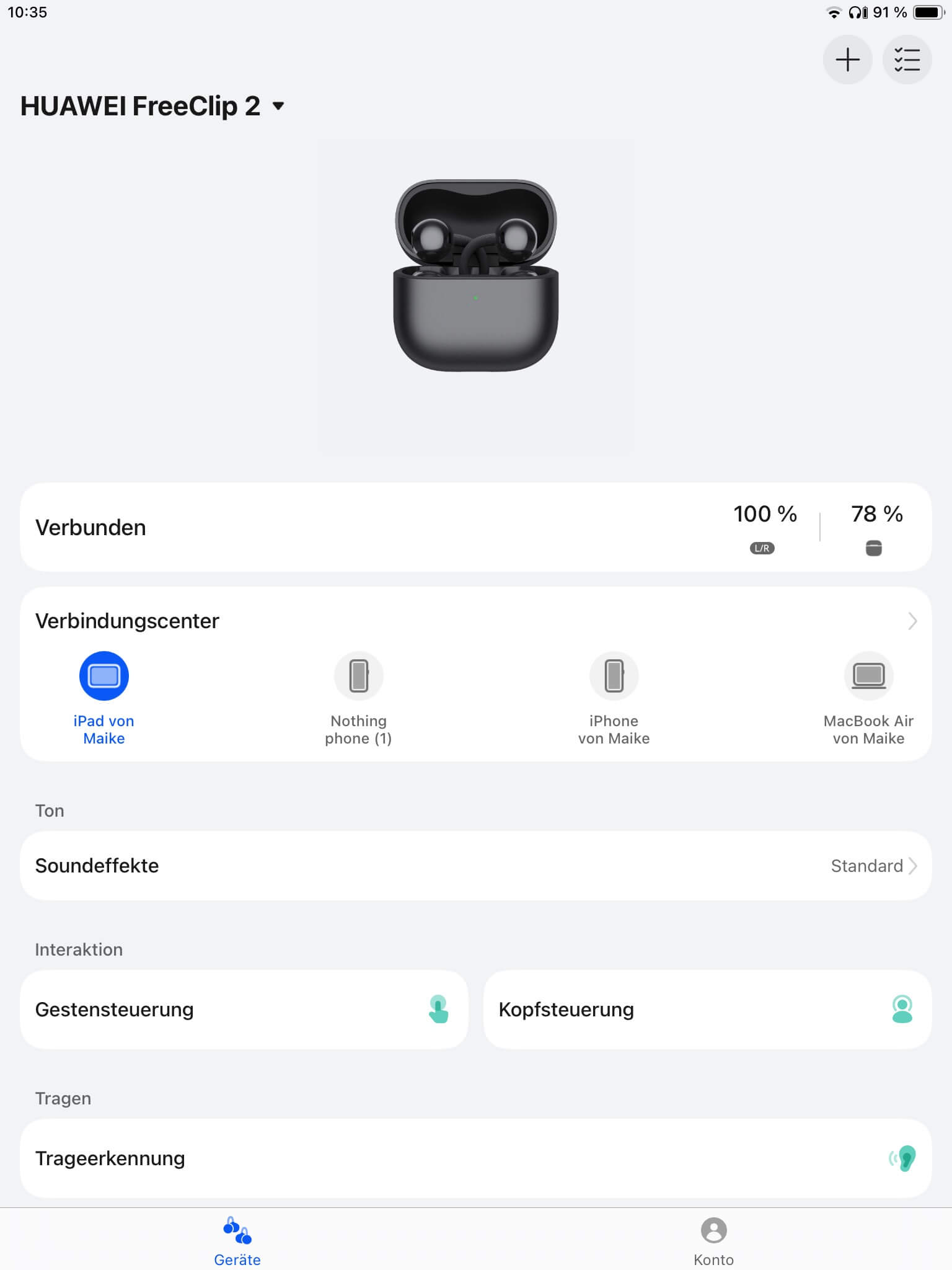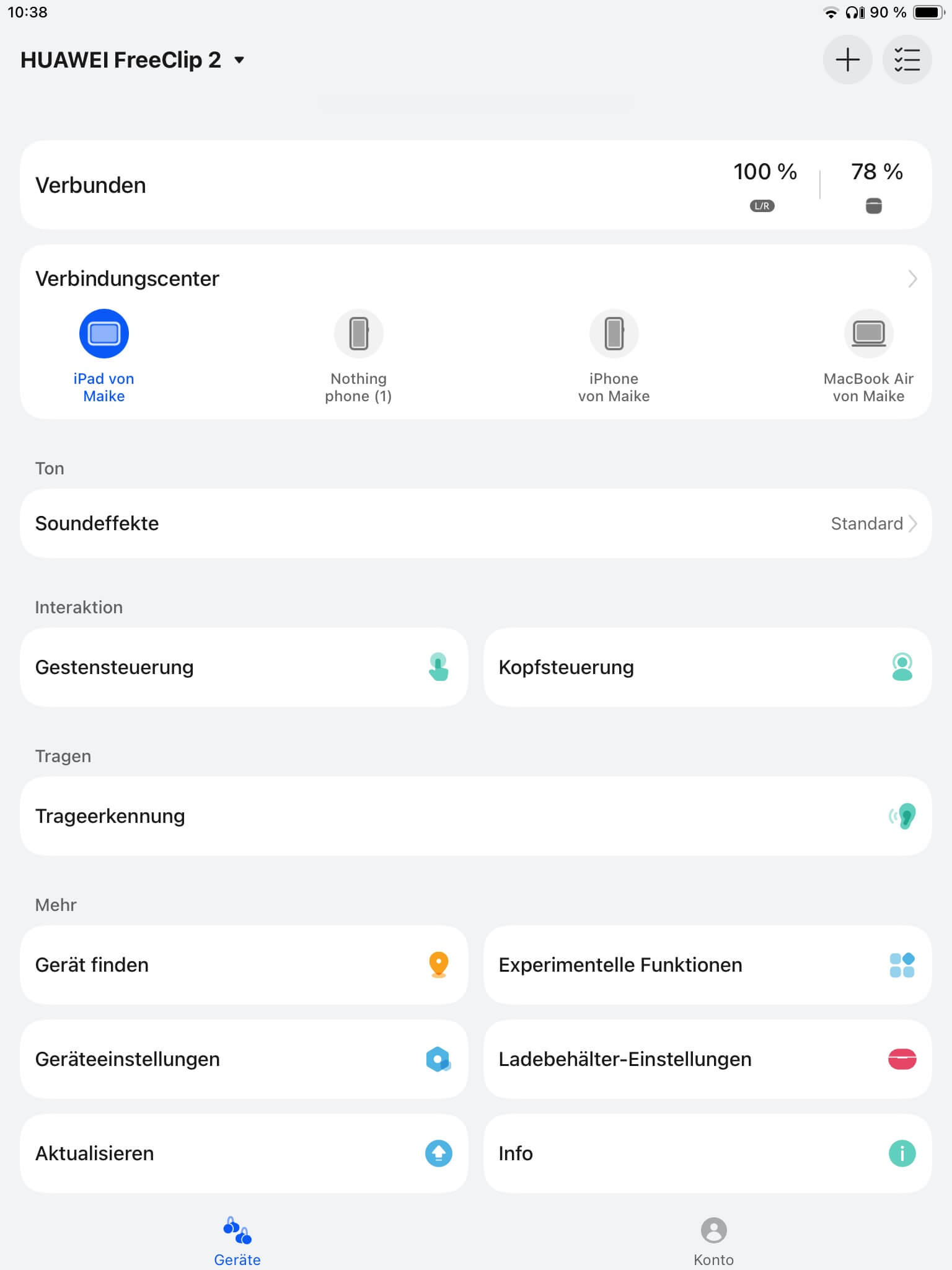 Über das Verbindungscenter lassen sich Multipoint-Verbindungen anzeigen und deaktivieren, zumal ein bevorzugtes Gerät für den Verbindungsaufbau festgelegt werden kann. Ergänzend zur Touch-und Kopfsteuerung, der Trageerkennung und automatischen Kanalanpassung ist zudem der Low-Latency-Modus konfigurierbar, was ebenfalls auf die akustische Rückmeldung des Lade-Cases zutrifft.