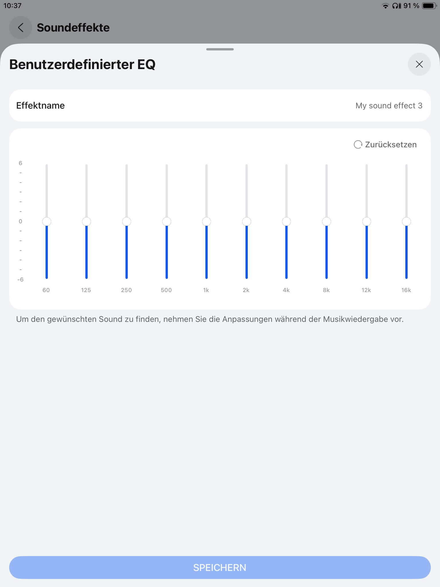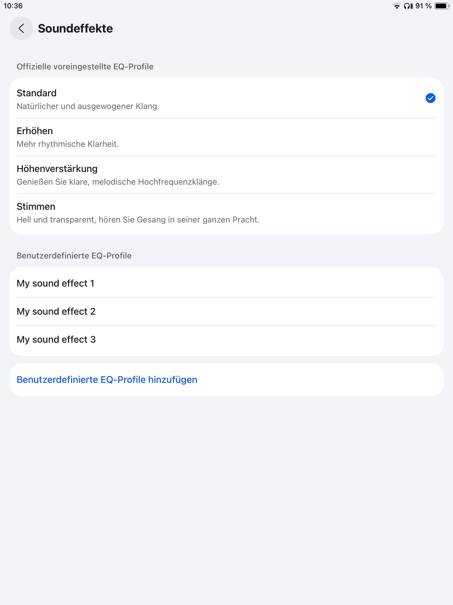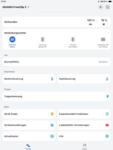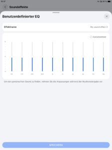 Die Klangregelung der App-Anbindung (iOS und Android per AppGallery oder als APK-Datei von der Huawei Homepage) umfasst neben der Standardeinstellung drei vorkonfigurierte Settings, um den Bassbereich, die oberen Lagen oder Stimmen zu verstärken. Neu ist ein 10-Band-EQ für eigene Einstellungen, wobei maximal drei Presets speicherbar sind.
