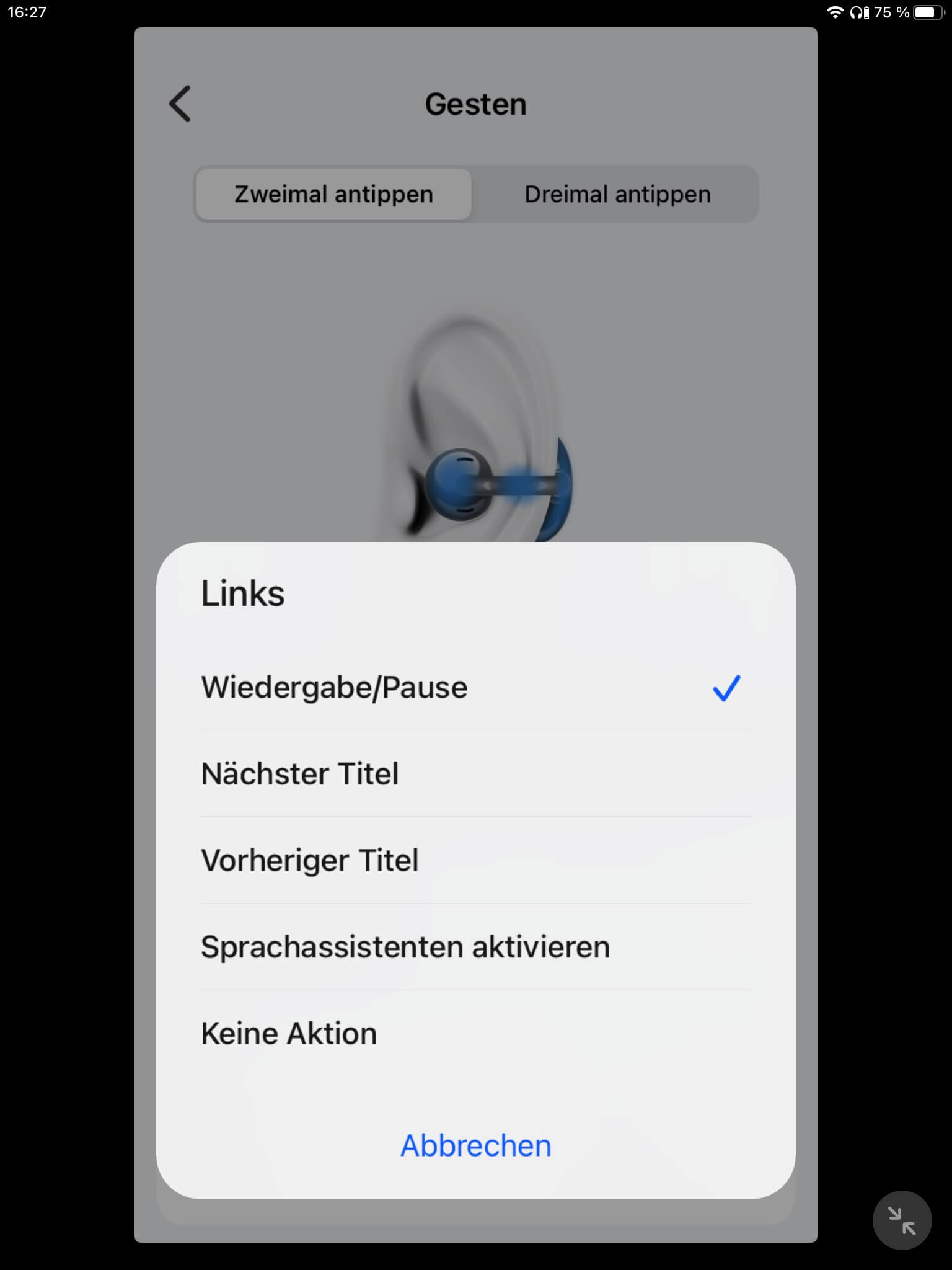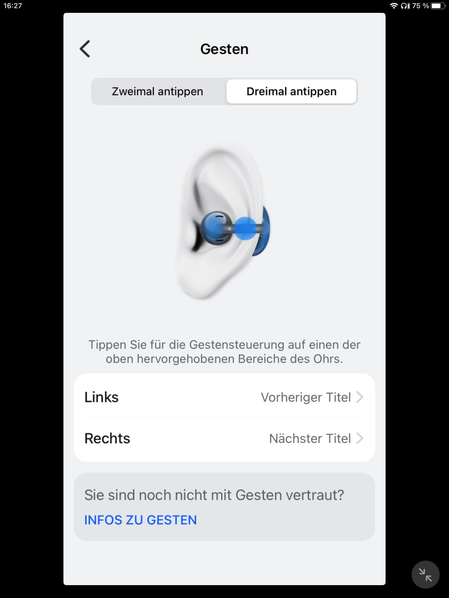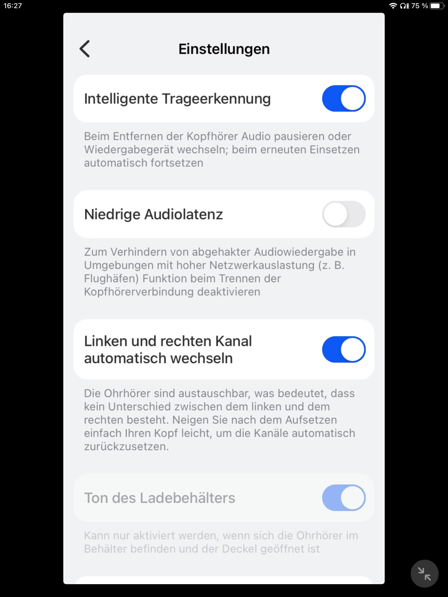 Mehr Optionen bietet die Touch-Steuerung allerdings nicht, sodass eine Lautstärkeregelung vermisst werden kann. Auch auf ein manuelles Ein- und Ausschalten der Hörer muss verzichtet werden. Genutzt werden kann hingegen eine Trageerkennung, die zuverlässig, aber mit einer leichten Verzögerung beim Ablegen reagiert und sich wunschgemäß ein- oder ausschalten lässt. Möglich ist zudem eine einseitige Nutzung im Single-Betrieb.