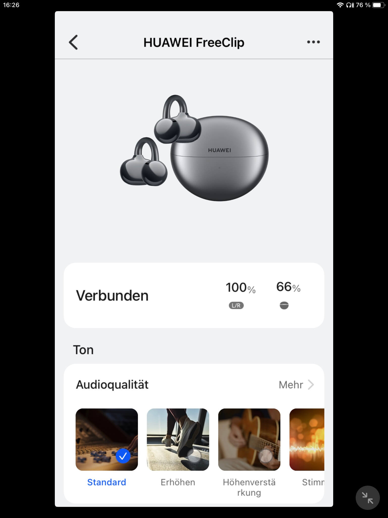 Zur Klanganpassung stehen über die App-Anbindung (iOS und Android per AppGallery oder als APK-Datei von der Huawei Homepage) drei vorkonfigurierte Settings zur Auswahl, um den Bassbereich, das obere Frequenzspektrum oder Stimmen zu verstärken. Was bisher fehlt und eine wünschenswerte Ergänzung darstellt, ist eine EQ-Sektion für eigene Einstellungen wie beispielsweise bei den Huawei FreeBuds Pro 3 (Test).