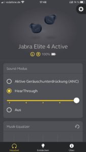 Auch der verbaute Transparenzmodus arbeitet solide. Ähnlich wie das Noise Cancelling bietet Jabras App eine fünfstufige Anpassung der Außengeräuschwahrnehmung. Das Grundrauschen wird dabei aber hörbar angehoben – wobei dies uns nur bei Stille oder sehr leisen Passagen wirklich auffällt. Auch die Jabra Elite 4 Active erreichen hier nicht die Natürlichkeit eines Apple AirPods Pro, künstlich wie bei einigen Mitbewerbern klingt es glücklicherweise nicht.