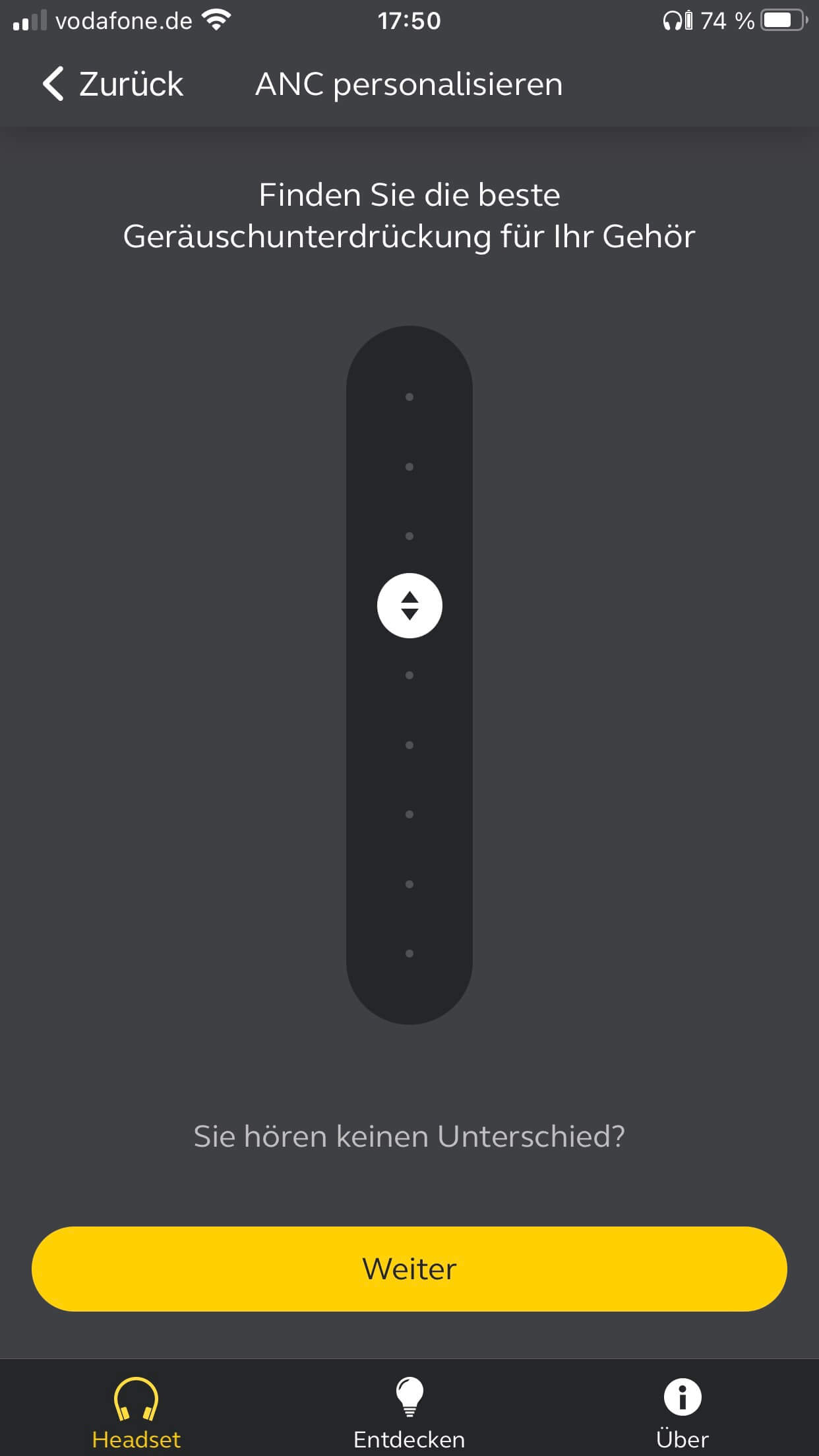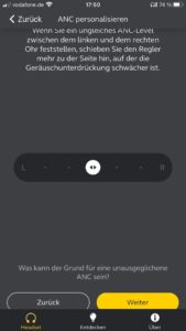 Das Noise Cancelling der Jabra Elite 4 Active kann via App, wie oben bereits erwähnt, in neun Stufen frequenzabhängig personalisiert werden. Dazu schiebt man den Regler auf die gewünschte Position, diese wird sodann behalten und ist sofort aktiv. Bei unseren Testbedingungen erzielte das Noise Cancelling auf Stufe 6 ein für uns zufriedenstellendes Ergebnis.