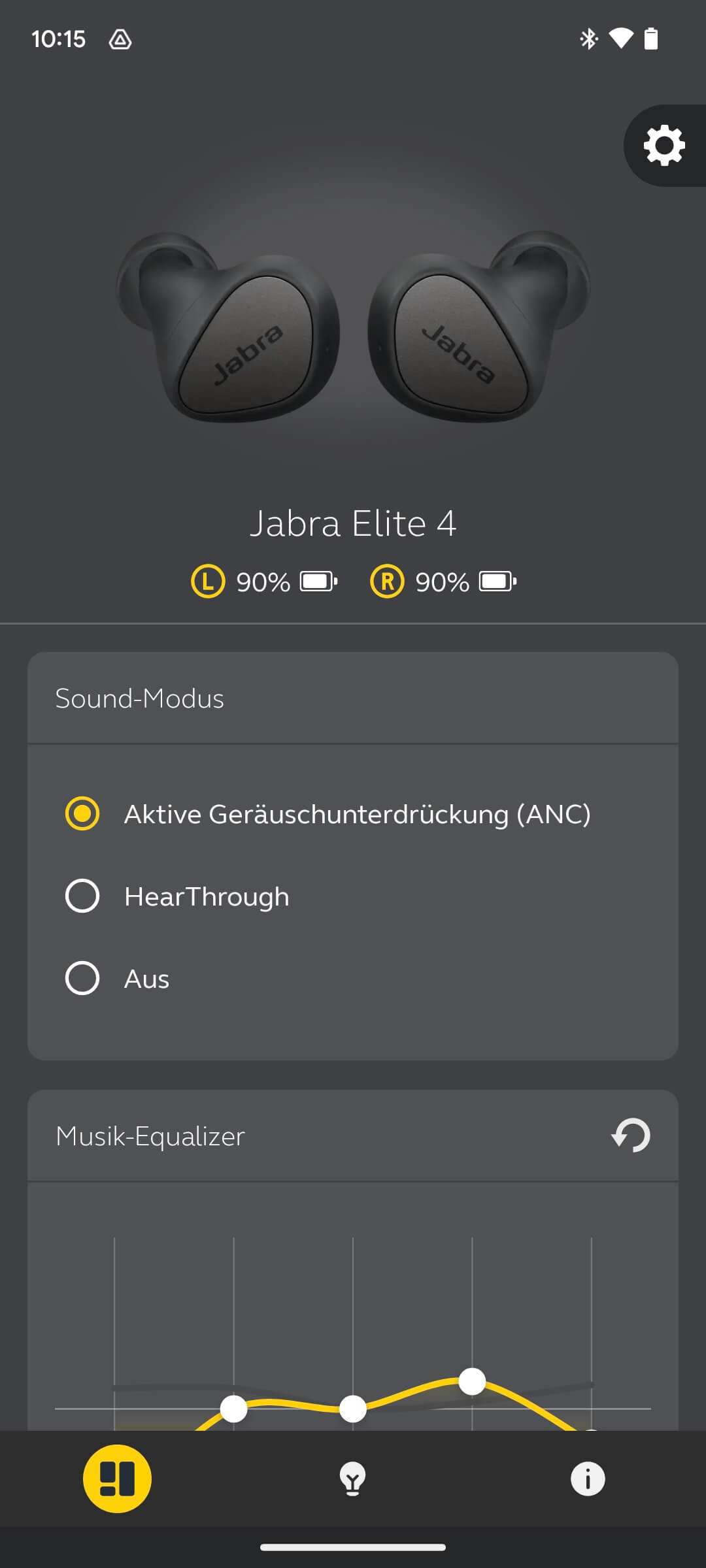Die aktive Geräuschunterdrückung (ANC) der Jabra Elite 4 personalisiert ihr via App über einen neunstufigen Slider. Dazu schiebt ihr den Regler auf die gewünschte Position, diese wird sodann behalten und ist sofort aktiv.