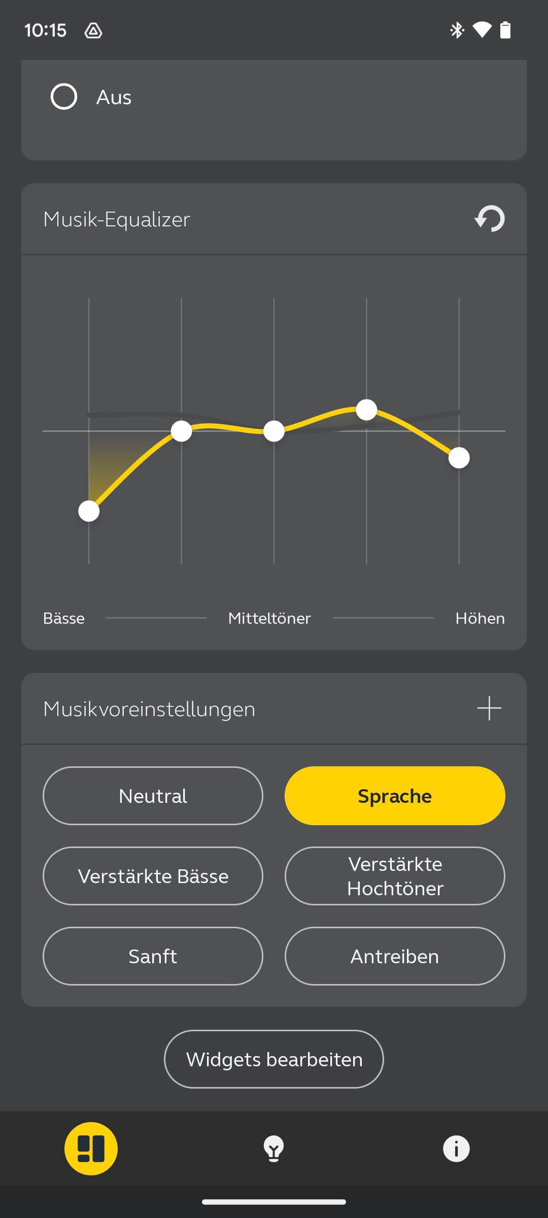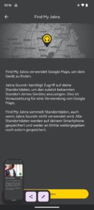 Zusätzlich kann das Noise Cancelling in neun Stufen eingestellt, aber auch zwischen sechs EQ-Presets gewählt werden, ein manuelles Verändern und Speichern des 5-Band-EQs ist hier ebenso möglich. Sidetone, also das Hören der eigenen Stimme während eines Telefonats, ist standardmäßig aktiviert und kann hier ebenso ein-/ausgeschaltet werden. Wer seine Kopfhörer verlegt hat, findet via „Find My Jabra“ besagte Stöpsel per Map und Hinweistönen wieder. Die Möglichkeit, Firmware-Updates aufzuspielen, den Akkustand abzulesen oder via Kurzanleitung die Grundfunktionen der Hörer kennenzulernen, runden den Funktionsumfang ab.