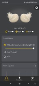 Mit der zugehörigen Jabra Sound+ App (iOS, Android) lässt sich der Klang der Elite 5 per Equalizer individuell einstellen. Mit den Hörprofilen „Pendeln“, „Öffentlich“ und „Privat“ stehen drei optimierte Voreinstellungen bereit. Außerdem kann hier mit dem MySound-Feature per Hörtest und persönlicher Informationen ein individuelles Hörprofil angelegt werden. Und auch die App selbst lässt sich dank Widgets personalisieren. Als spezielle Funktion wird außerdem „Spotify Tap“ geboten. Damit kann Spotify auf dem verbundenen Smart-Gerät mit einem Fingertippen an der Stelle weitergehört werden, wo es zuletzt angehalten wurde.