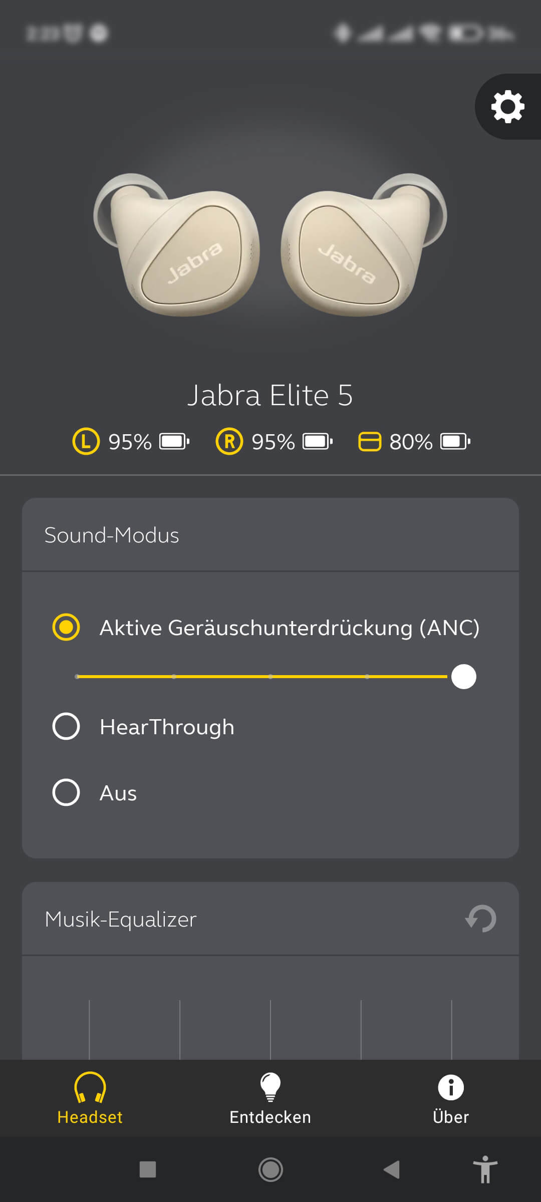 Der Ambience-Modus der Elite 5 zeigt sich dagegen nur bei sehr niedrigen Lautstärken hilfreich. Er lässt vor allem Stimmen hindurch. Das geschieht jedoch so leise, dass der eigentliche Sinn der Funktion nicht wirklich erfüllt wird. Hier ist die ansonsten überzeugende klangliche Abstimmung der Elite 5 ausnahmsweise nicht so gut gelungen. Dennoch macht Musikhören mit diesen Kopfhörern einfach Spaß.