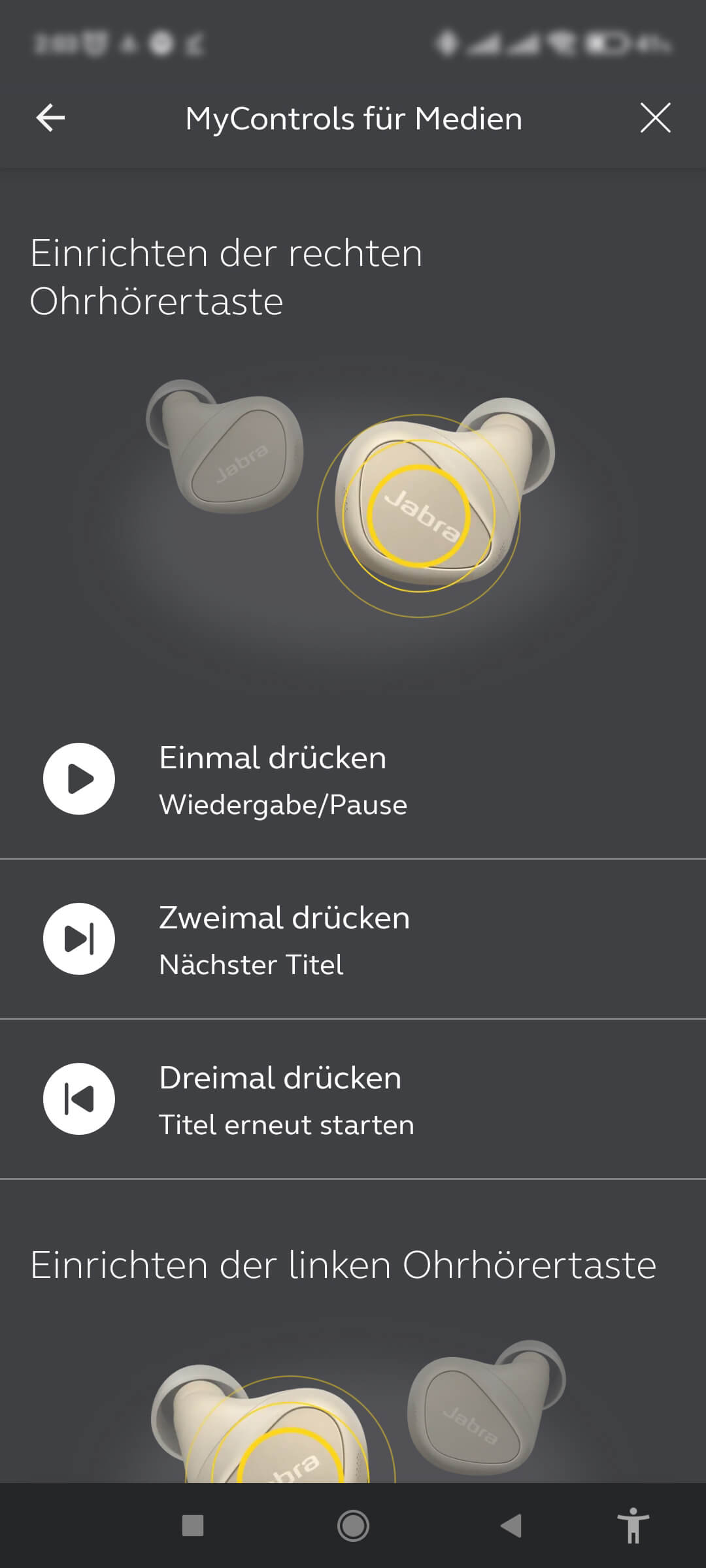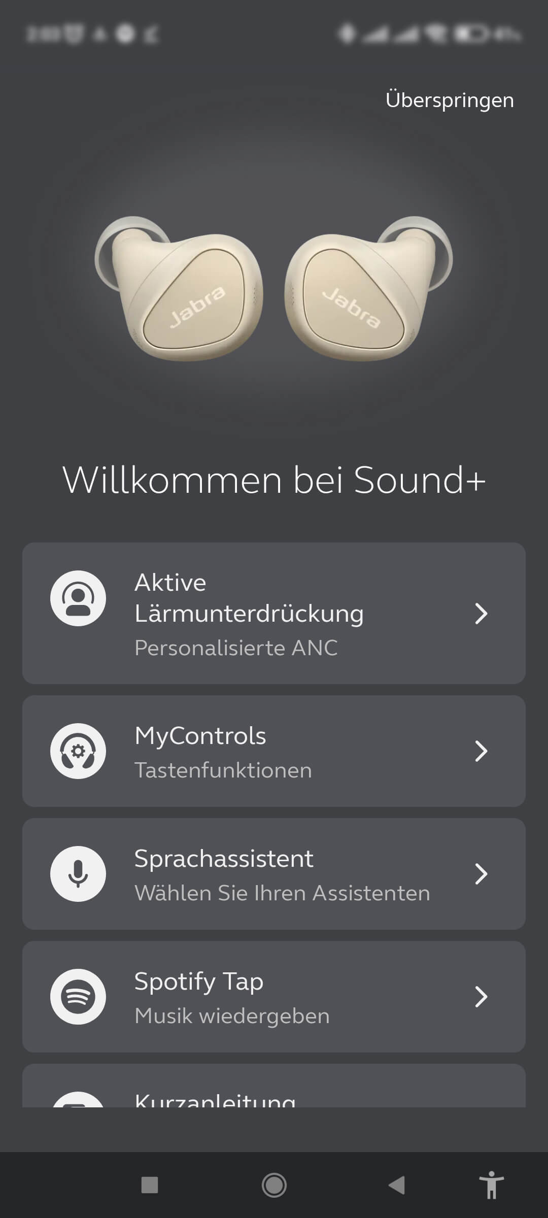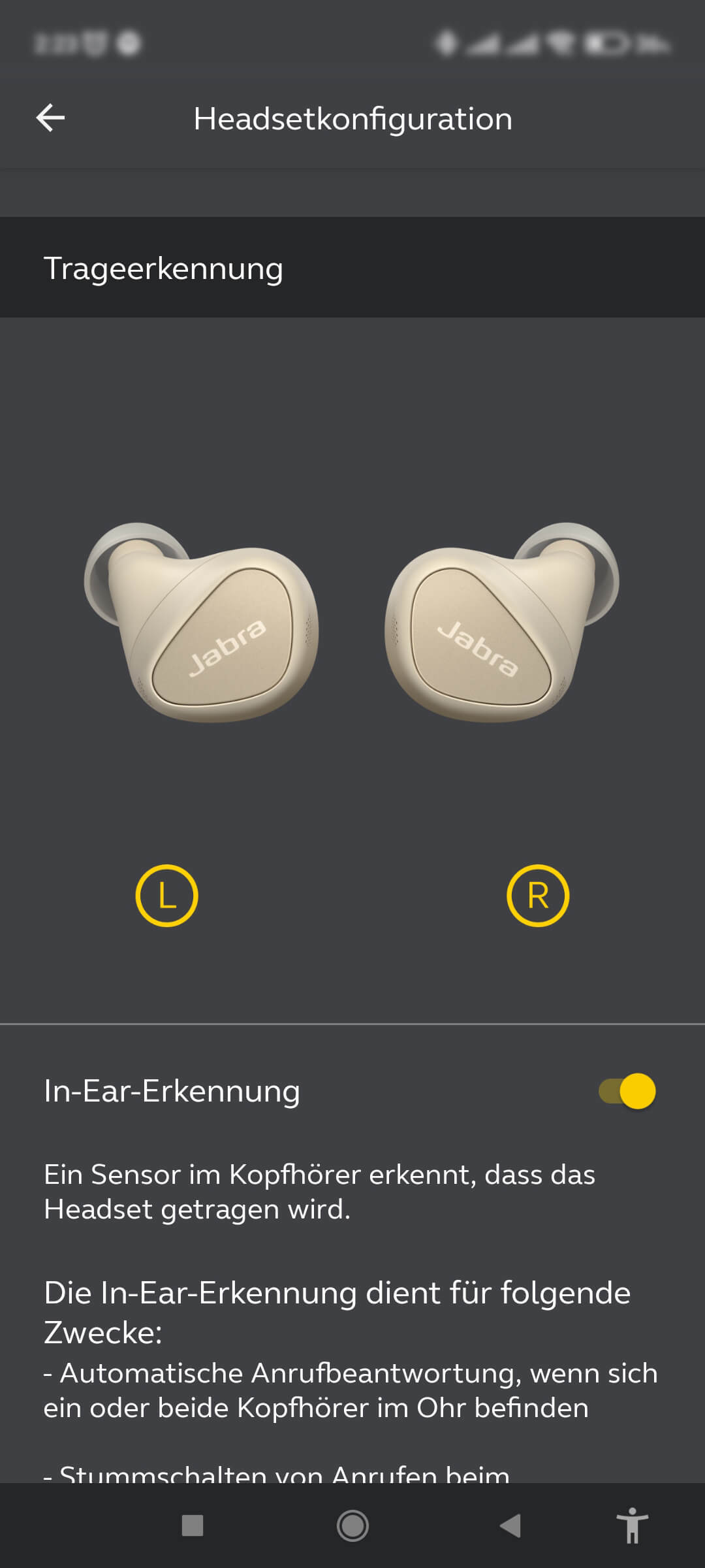Für das Pairing der Jabra Elite 5 werden einfach beide Tasten für drei Sekunden lang gehalten. Mit Android- und Microsoft-Geräten kann noch dazu Fast Pairing bzw. Microsoft Swift genutzt werden. Das Pairing und das Verbinden der In-Ears werden von einer weiblichen Assistenzstimme begleitet. Auf Android-Geräten werden während des Herstellens der initialen Bluetooth-Verbindung außerdem große Tool-Tipps eingeblendet. Entsprechend komfortabel ist das Einrichten dieser Kopfhörer. Die übrigen Funktionen ziehen allerdings ein wenig Lernaufwand nach sich. Denn nicht weniger als 13 verschiedene Funktionen lassen sich mit den beiden Tastern dieser Earbuds steuern. Die Elite 5 überraschen im Test auf einem Android-Smartphone mit einer über die Statuszeile aufrufbaren Steuerung für das ANC-Feature. Obendrein werden dort auch noch alle die Akkustände der Kopfhörer und des Lade-Cases angezeigt. Die Earbuds erkennen übrigens selbsttätig Windgeräusche und schalten dann automatisch das ANC-Feature ein.