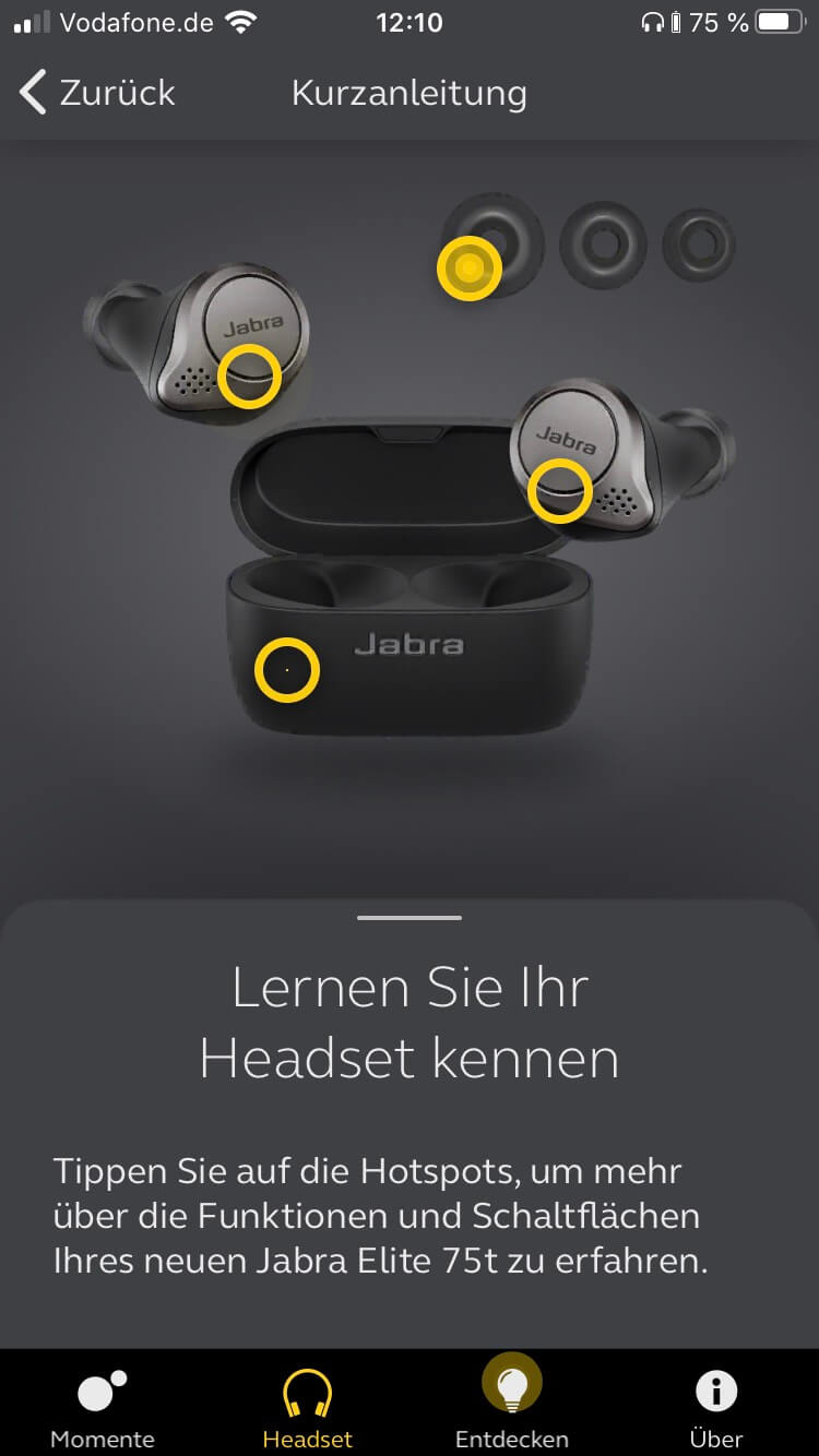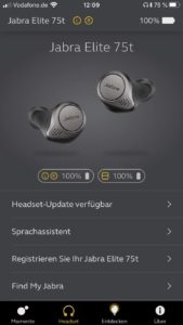 Über die beidseitigen Schaltflächen mit angenehmem Druckpunkt sind die Elite 75t sehr gut und zielsicher steuerbar, wobei links und rechts unterschiedliche Befehle zugeordnet sind, die man in der App (siehe unten) übersichtlich präsentiert bekommt: „Start“, „Stop“, „Telefon“, „Skip“, „Volume“, „digitaler Assistent“ und „Hearthrough“ – also die Außengeräuschzumischung über die eingebauten Mikros – sind alle am Ohr steuerbar, und somit bleibt das Device in der Tasche. Nimmt man einen Stecker aus dem Ohr, stoppt das Programm und wird fortgesetzt, sobald der Stecker wieder drin ist.